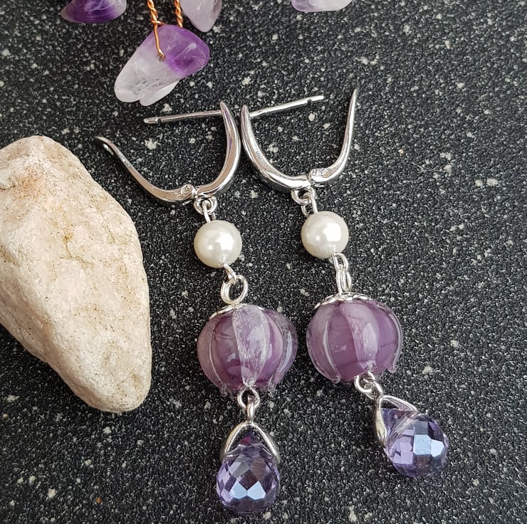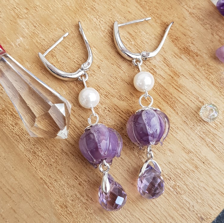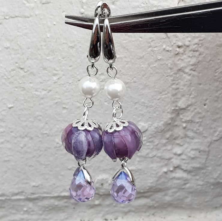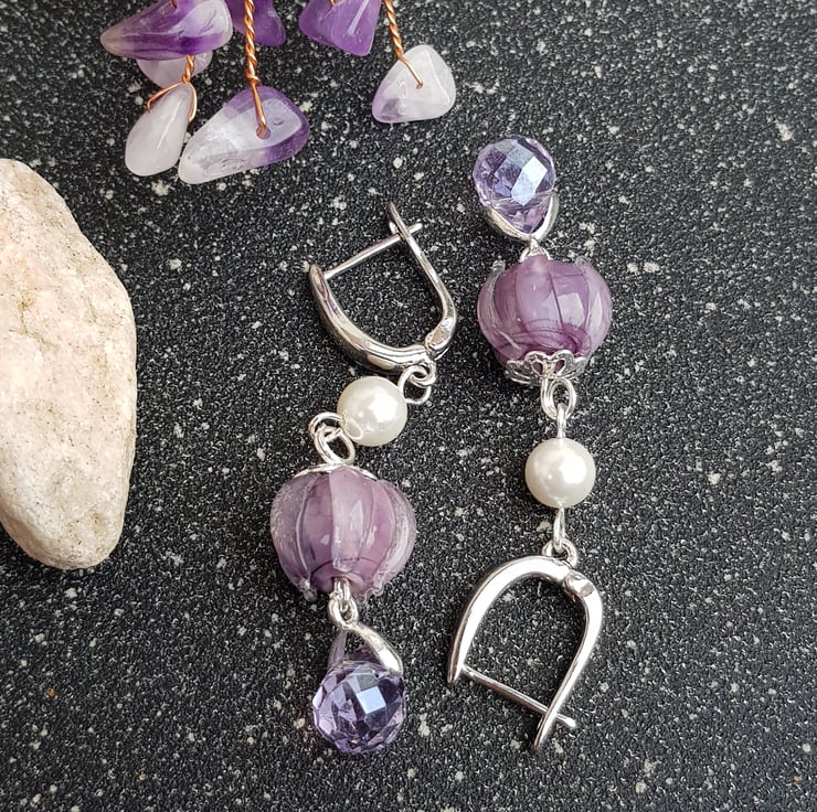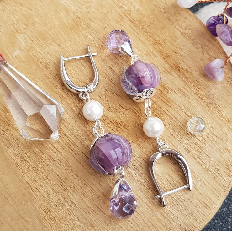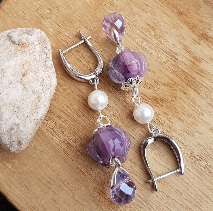 The earrings are decorated with purple glass bell flower beds, pearls and Austrian glass crystal beads.