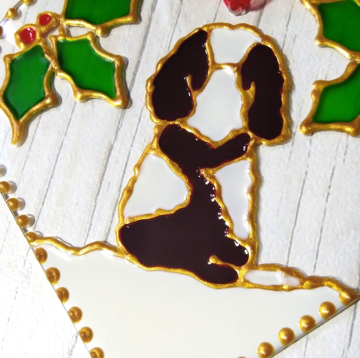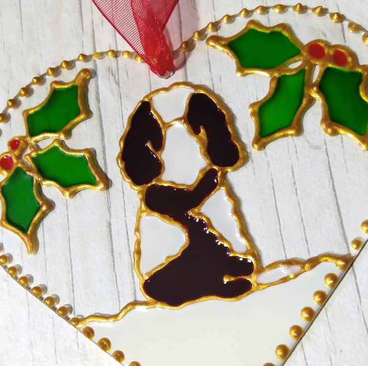 This is a 10cm x 9cm glass heart. A lovely Cavalier King Charles Spaniel decoration. Finished with an organza ribbon for hanging. A beautiful addition to any tree or window this Christmas. These decorations make a lovely gift.