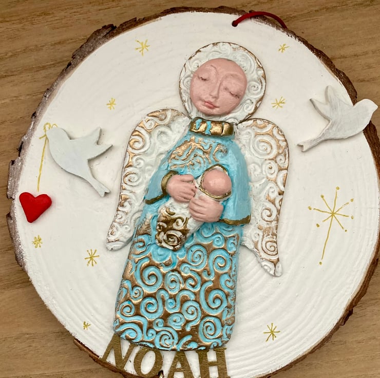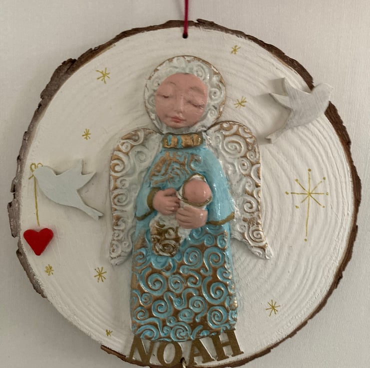 Personalised Reiki Infused Hanging Decoration on a large log slice, for baby Noah, Guardian Angel hanging decoration.