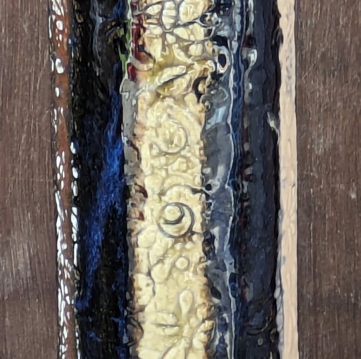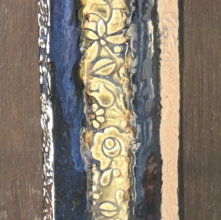 Glossy blue stripes in between flower imprinted stripes of white, beige and brick red.
