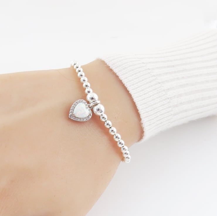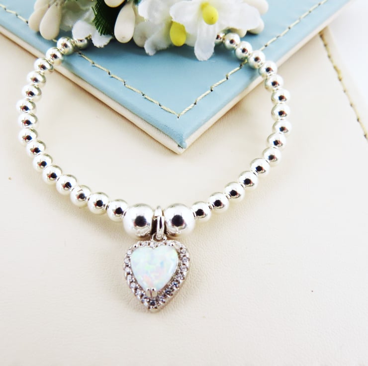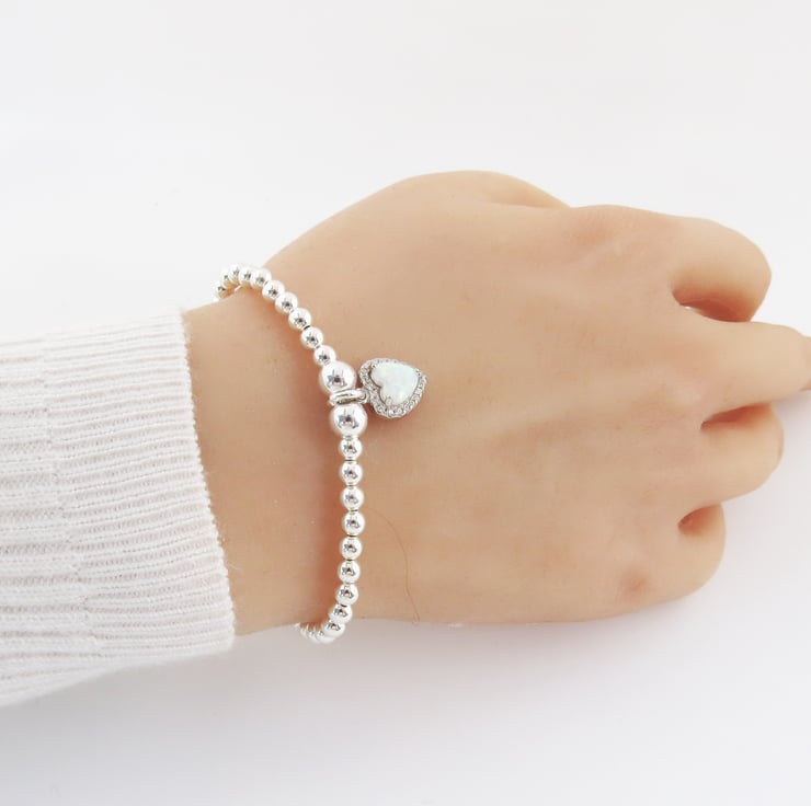 What all brides is this stunning white heart opal charm that dangles from sterling silver bead stretch bracelet. This bracelet will make a stunning gift for your bridesmaids. Also deal for every day wear a lovely keepsake gift.