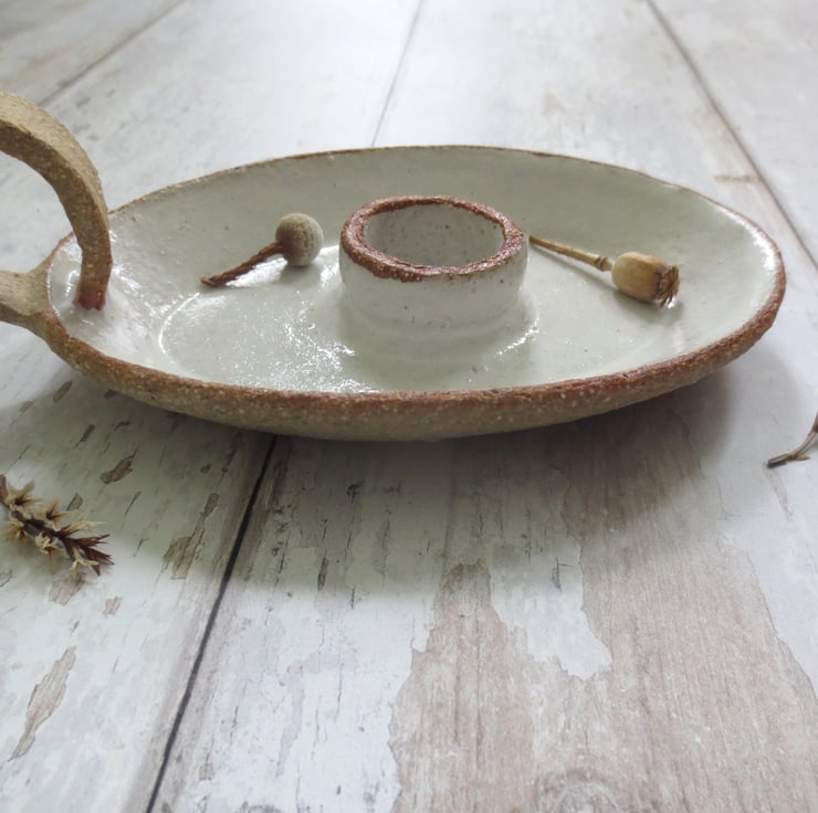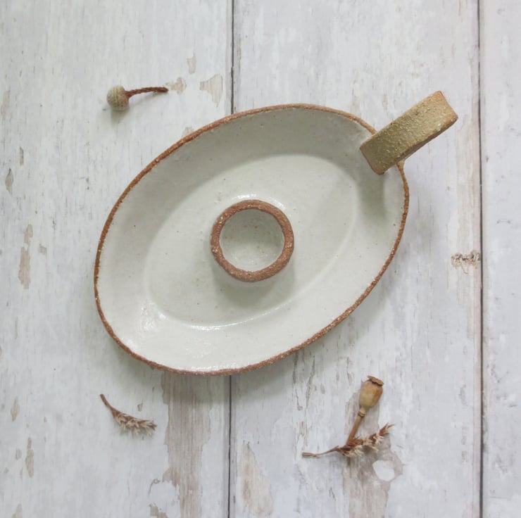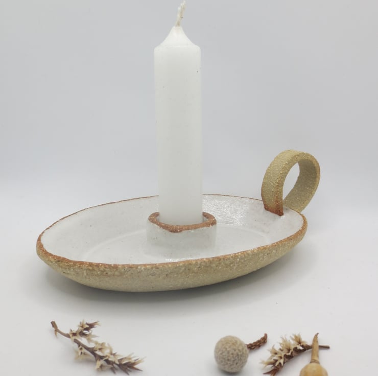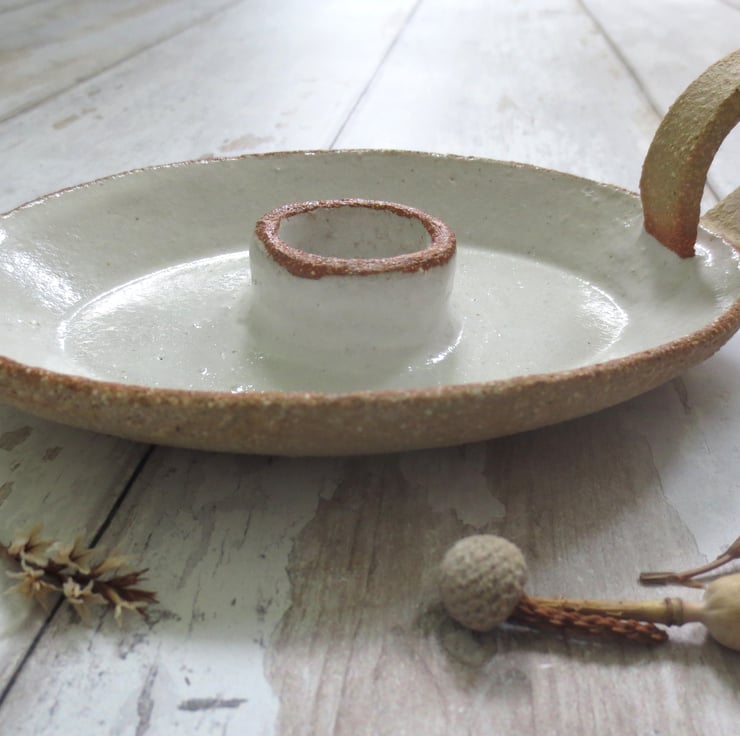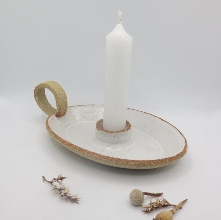 Beautiful oval candle holder with handle, hand built from textured buff coloured clay, with a shiny white glaze. Will hold a standard household candle.