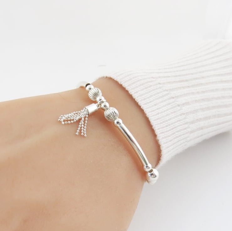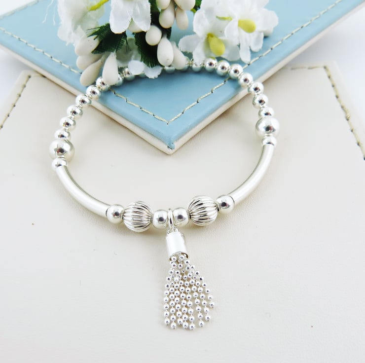 Stunning silver tassel charm that dangles from a sterling silver bead stretch bracelet. This bracelet will make a stunning gift for your all occasions. Also ideal for everyday wear a lovely keepsake gift.
