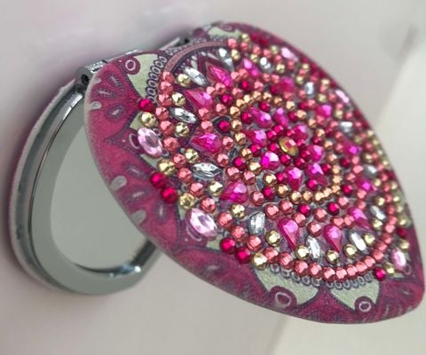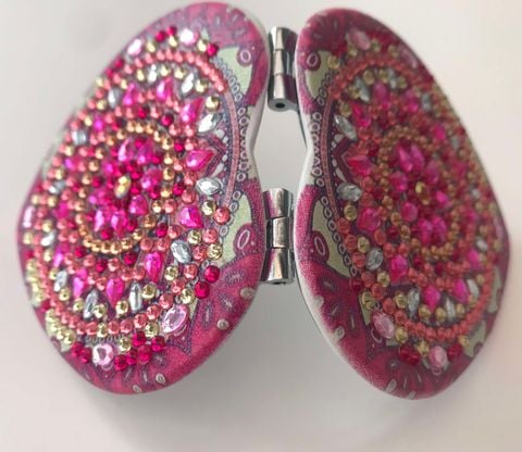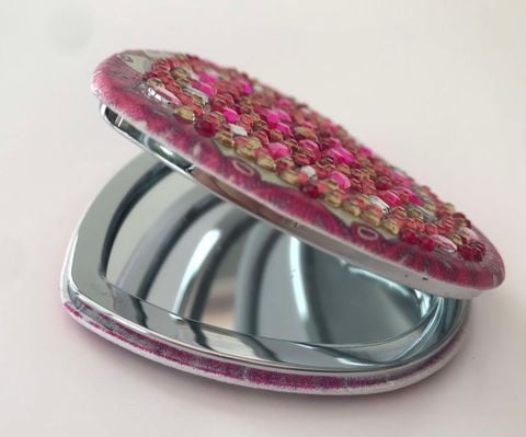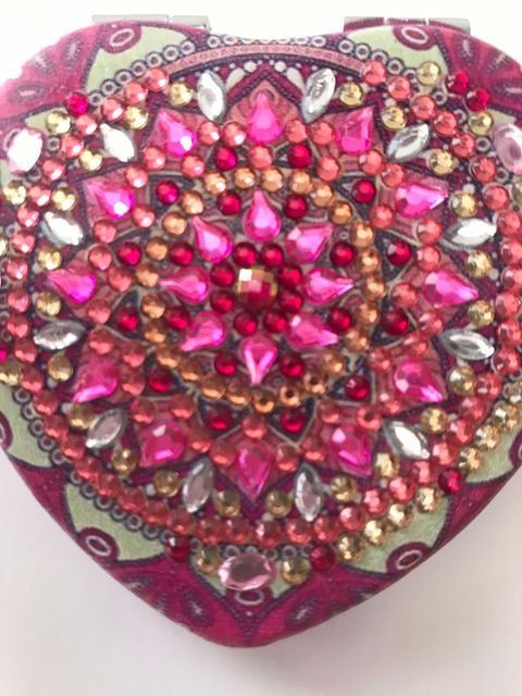 Small Mirror, heart shape, suitable for purses and travel, adults and ladies. Mandala pattern makeup mirror double-sided Diamond Art. Beads are manually placed by myself on the floral design, on synthetic leather. Work on it for about one hour, both sides. Beads shape: round.