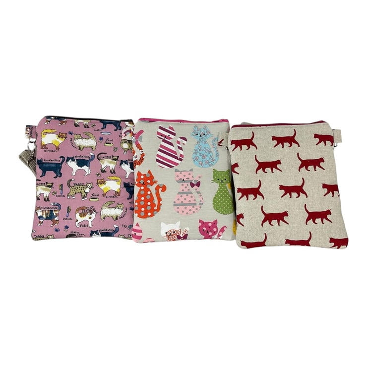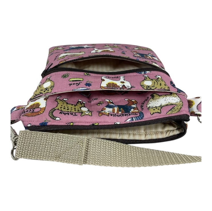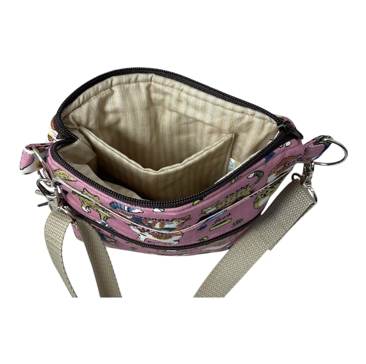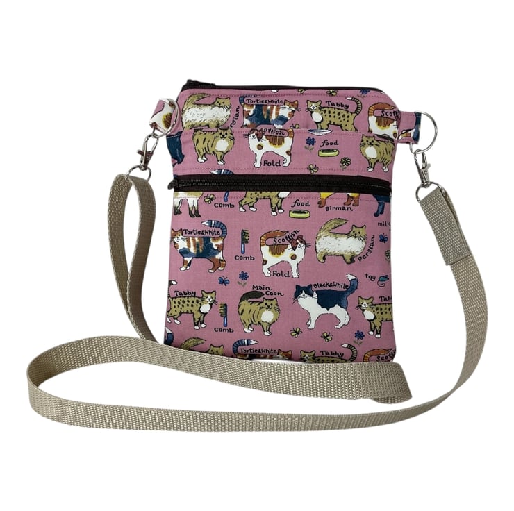 A choice of 3 cute cat print small phone sized shoulder bag . This handy bag is slim so sits close to your body, and will hold the basics when you want to grab a small bag for a trip out. I have managed to fit a purse, my phone (iPhone XS in a case) and a diary.