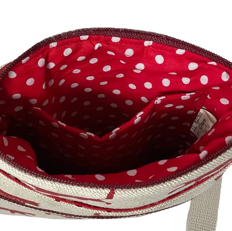 inside is a phone pocket that can hold my iphone 6 in its case. There are also another 2 pockets externally, one a full width slip and another zipped which is also full width. The strong nylon heavyweight webbing strap is colour coordinated and is fully detachable, it clips on with 2 swivel lanyard clips. The strap itself is approx 133cm (52.5") in length, long enough to go across your body and is fully adjustable. Each bag closes with a toning zip. The bag is fully wadded and interfaced for structure. contents shown for display and not included in sale. pattern placement may vary.