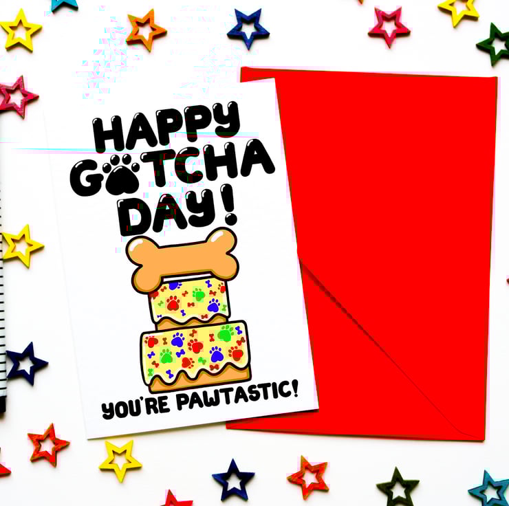 Celebrate the joy of adopting a new furry friend with this heartfelt and fun Dog Gotcha Day Card! Whether it’s for a newly adopted dog, a foster pup finding their forever home, or a puppy rescue story, this card is the perfect way to mark the special day. With a cheerful message on the front, “HAPPY GOTCHA DAY! YOU'RE PAWTASTIC!”, it’s guaranteed to bring smiles and tail wags.