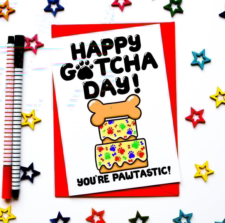 Greeting on front: HAPPY GOTCHA DAY! YOU'RE PAWTASTIC!