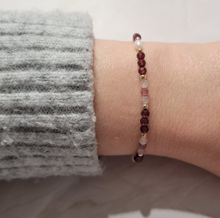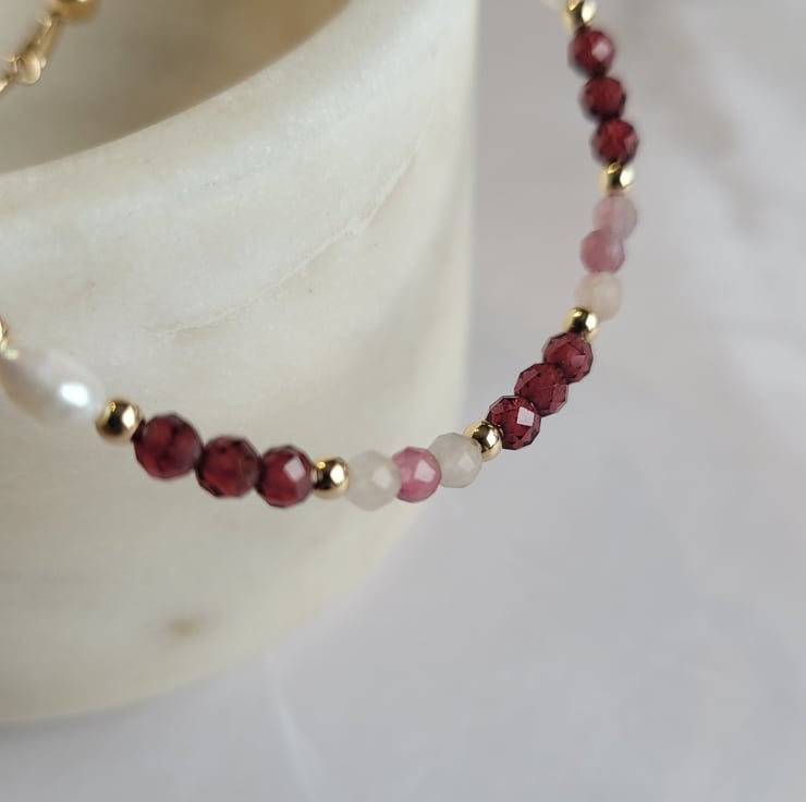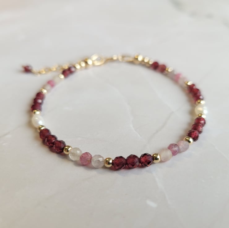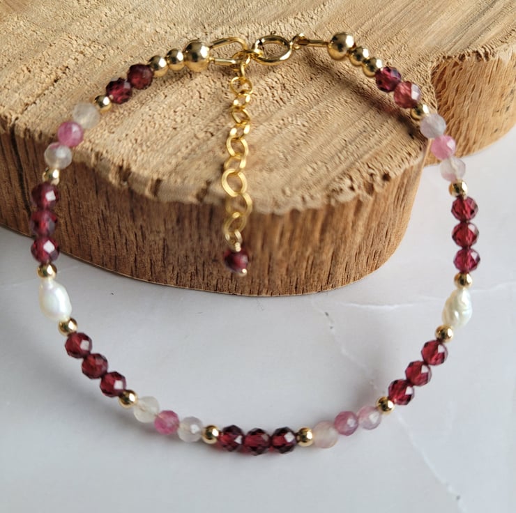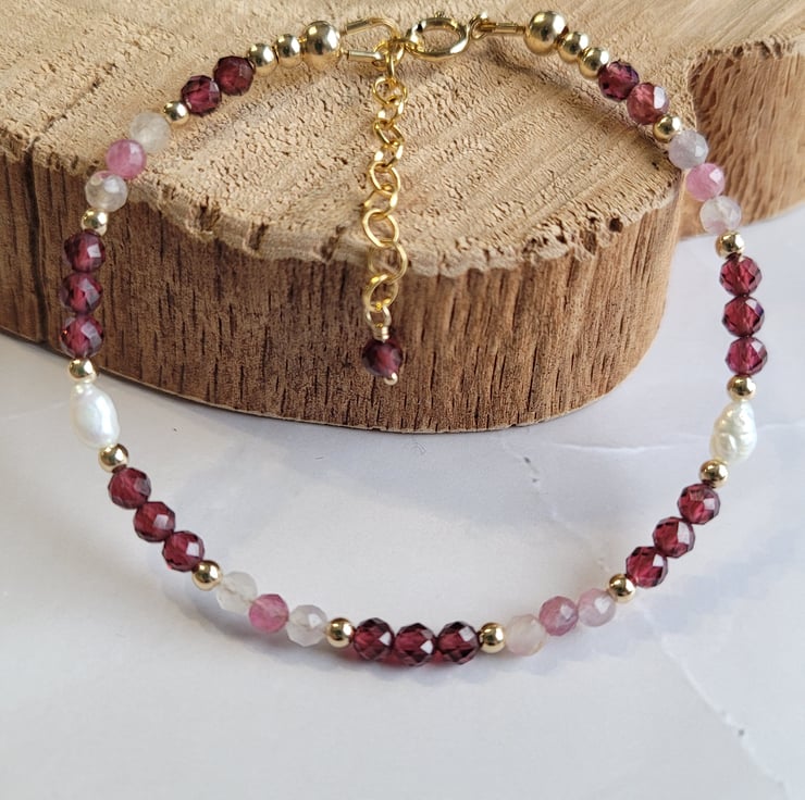 This beautiful gemstone bracelet is handmade with semi-precious rhodolite garnet, tourmaline and freshwater pearls. The gemstones and pearls are spaced with 14kt gold filled beads. This piece of jewellery is finished with a gold filled clasp and extension change, allowing a variable length of 17-20cm.