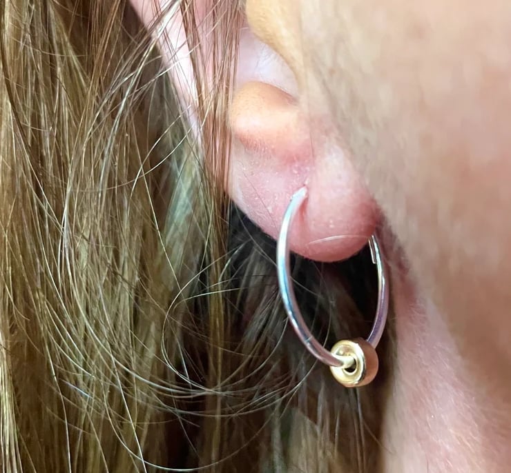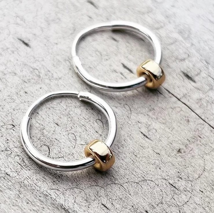 Mixed metal trend. A larger version of my best seller, which are 12mm in size, sleeper hoops with 14k rondelle flat beads, the beads do slide on and off so you can change your charms or wear alone. Free gift box tied with ribbon.