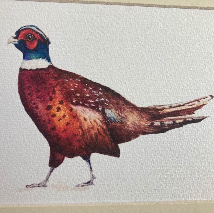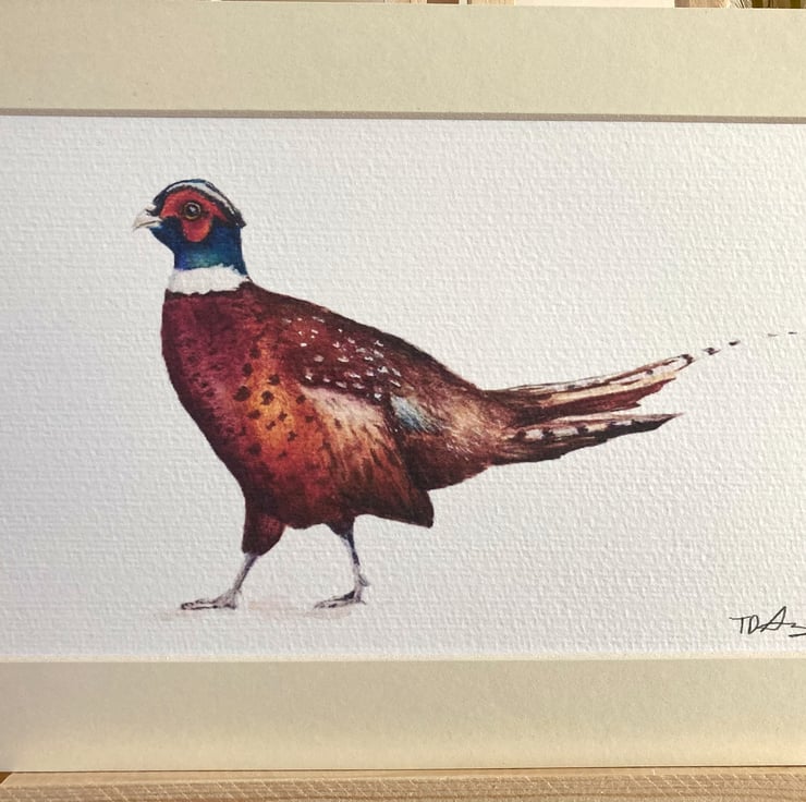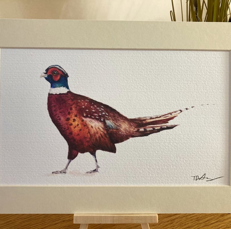 This beautiful pheasant print is a one-of-a-kind piece of art based on my original watercolor painting. This a4 print is produced on high-quality archival textured matte paper using a premium inkjet printer. It measures 21 cm in height and 29.7 cm in width. Each print is signed and comes mounted, ready to be displayed in your home. The pheasant is depicted in stunning detail, capturing the essence of this magnificent animal. This unique piece of art is perfect for any animal lover or art enthusiast.The perfect christmas gift for a loved one.