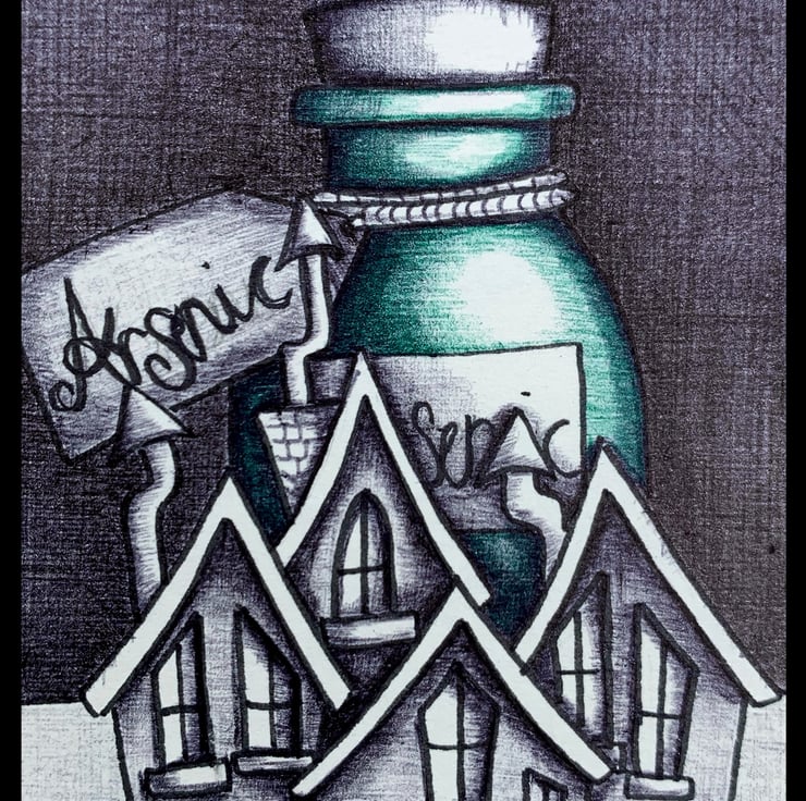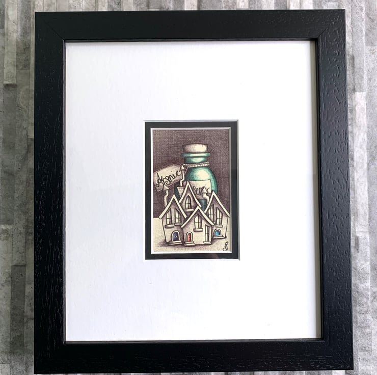 A mini Pen and Ink illustration of a bottle of Arsenic and Fairy houses from a series called 'Pick your Poison'.