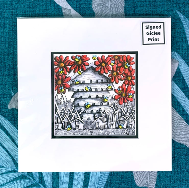 The Hive Giclee print of a pen and ink illustration of a bee hive with bees and flowers. The print tis the size of the original piece and measures 15x15cm the mount is 27x27cm