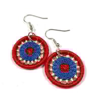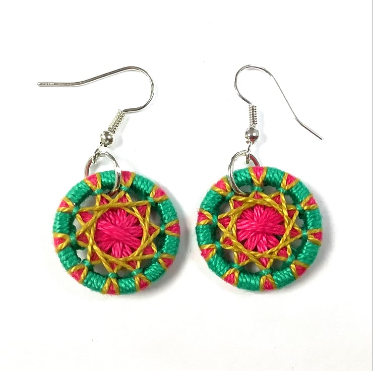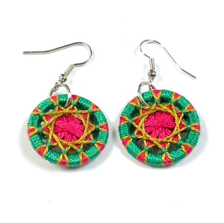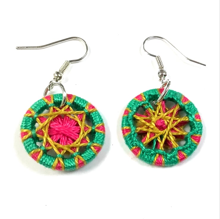 These earrings have been made by winding Cotton Perle thread around a metal ring to form intricate designs. They are known as Zwirnknopfe buttons. Each button is 2cm and hangs from silver plated earwires.