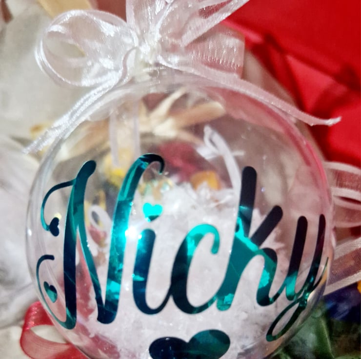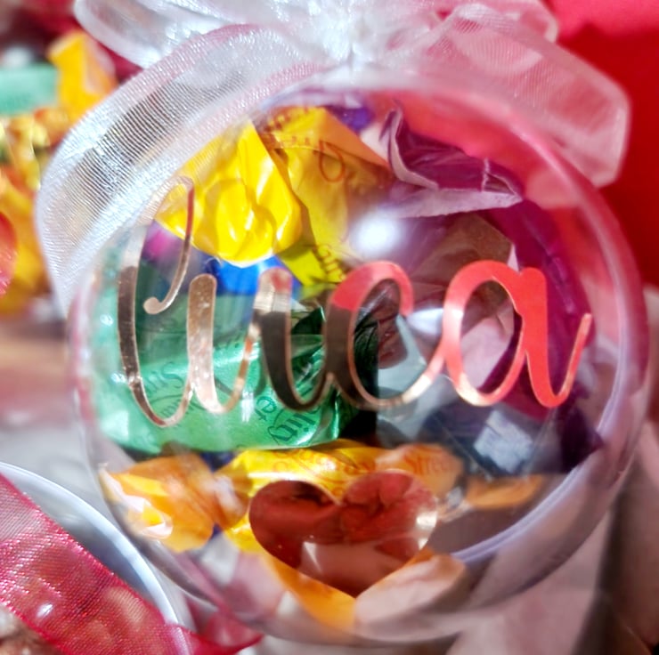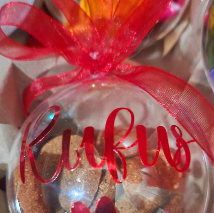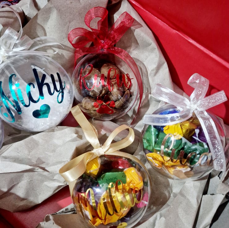 These medium sized baubles can be filled with any treats you like. They work well for kids, pets, adults, grandparents, friends, teachers, and those who are no longer with us. Text is created using metallic, permanent vinyl and can be created in most colours. Ribbon colours are white, gold, red and silver. Please remember to include the name, text colour and ribbon colours when placing your order.