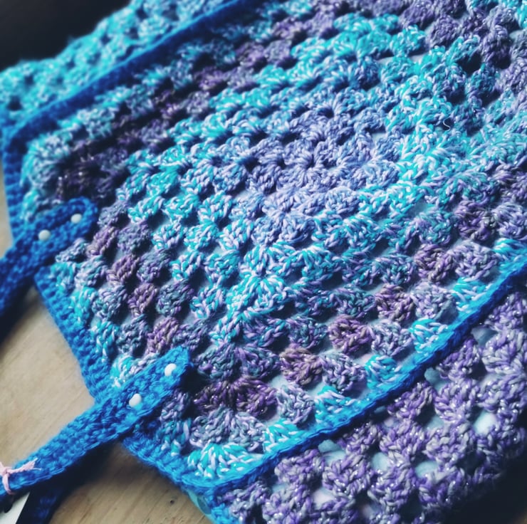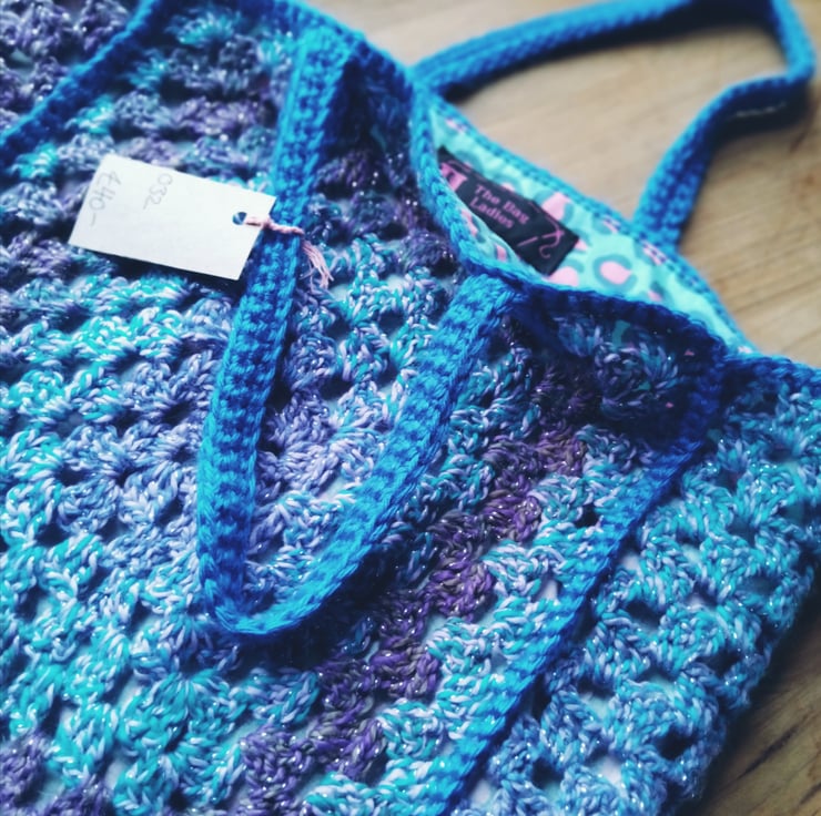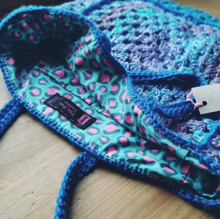 The bag is crocheted in gorgeosly soft, multicoloured yarn. Each bag is fully lined in a fabric to compliment the colours of the bag.