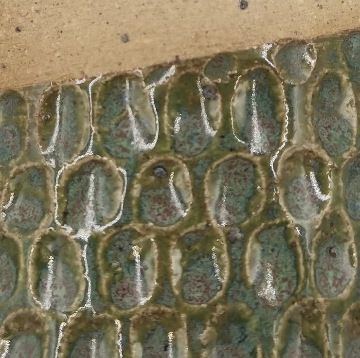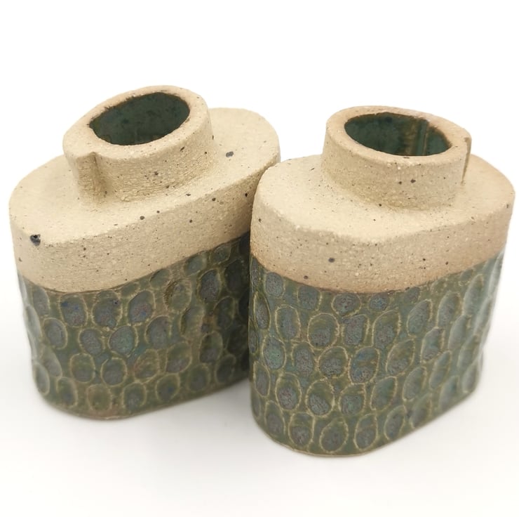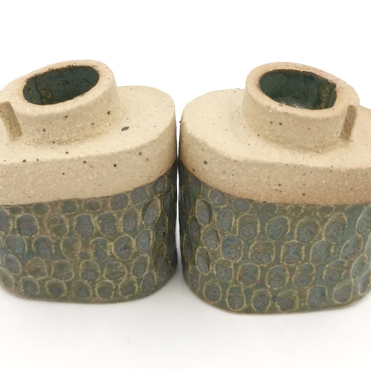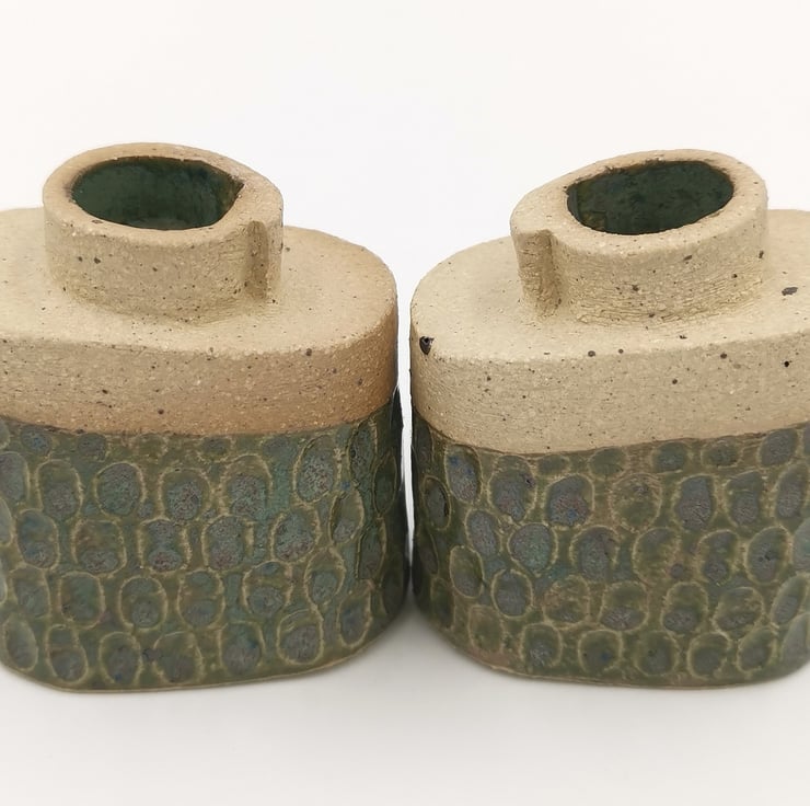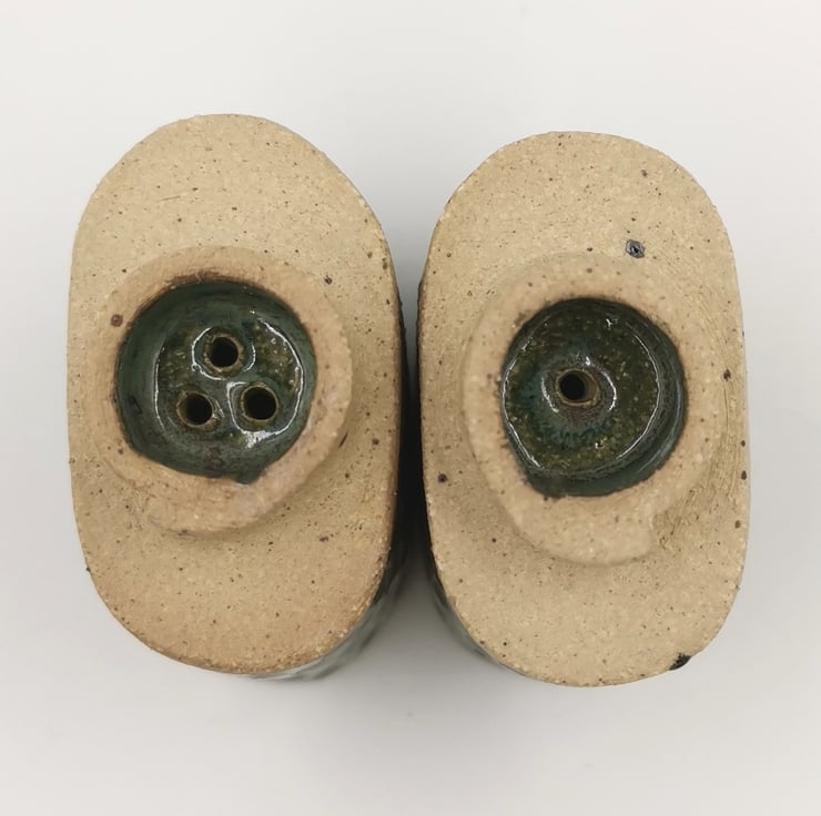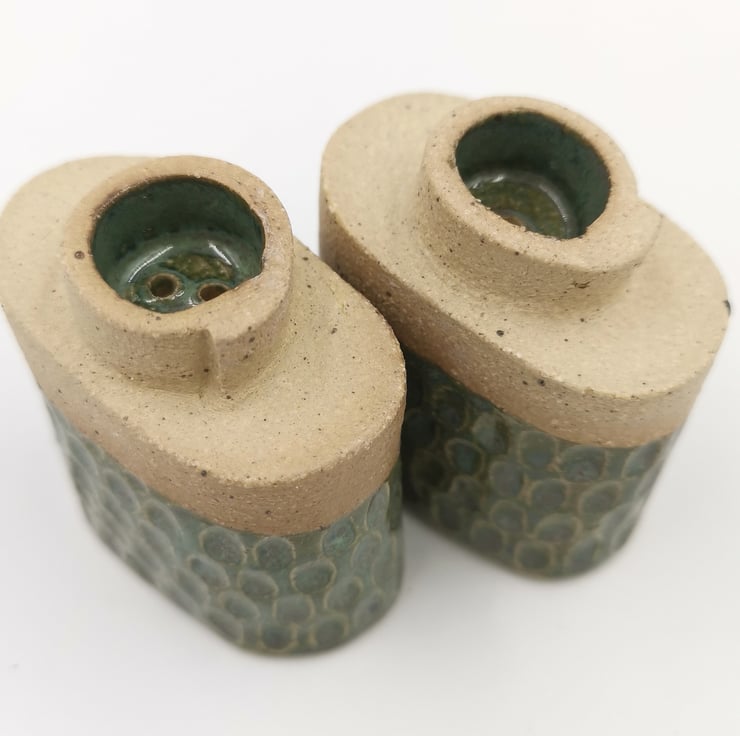 Handbuilt, hand-carved ceramic salt and pepper pots - cruet set. These salt and pepper pots are slab built in stoneware clay with a carved 'fish scale' texture and finished in a green glaze.