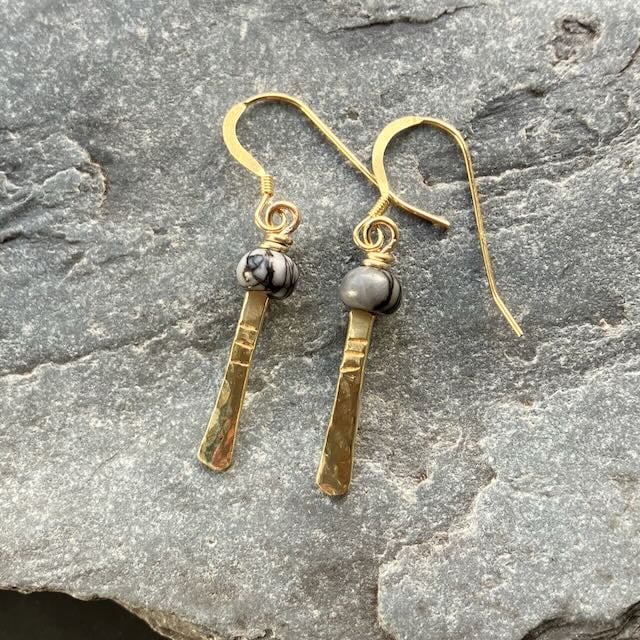 These sweet little drop earrings have a beaten brass tail topped with an intricately patterned black and grey jasper bead . I have put a simple incised pattern at the top of the drop. The ear wires are gold vermeil (gold covered sterling silver).