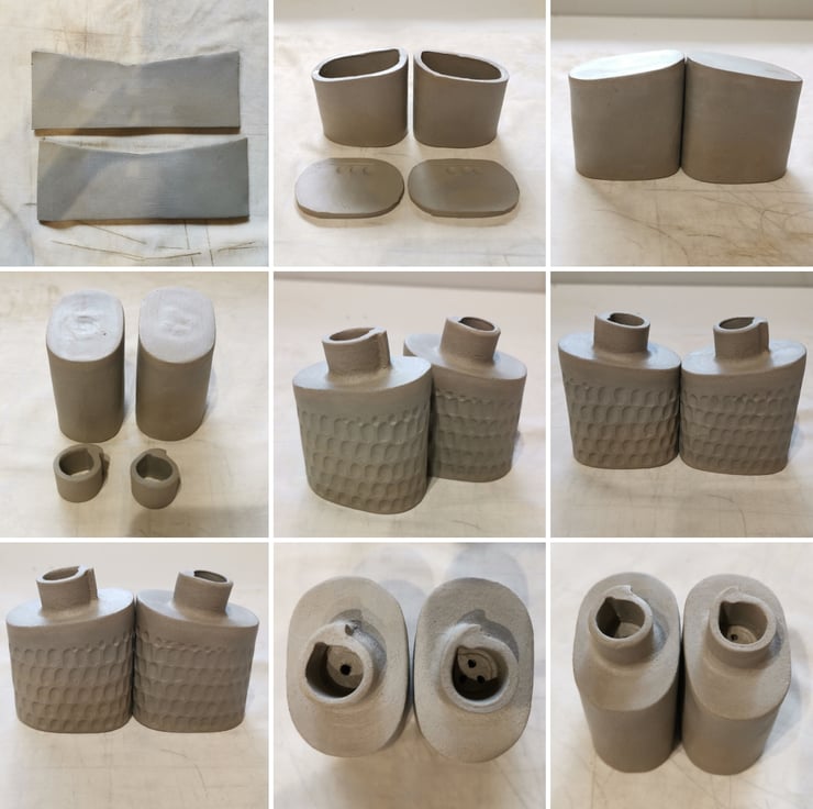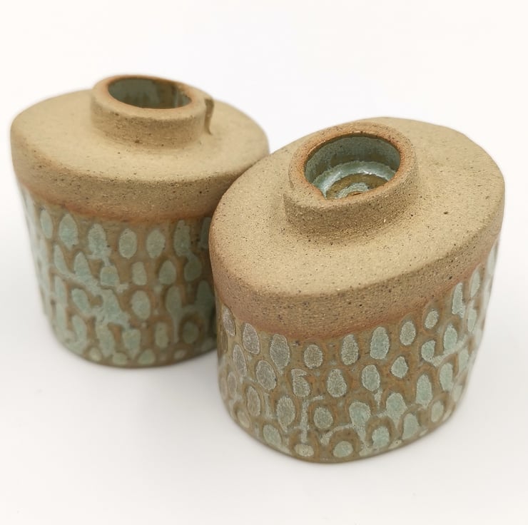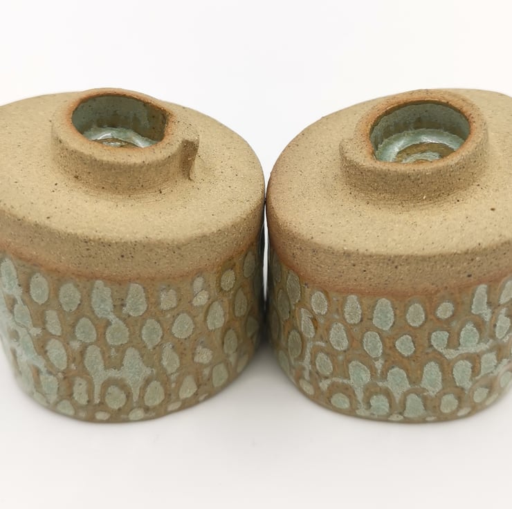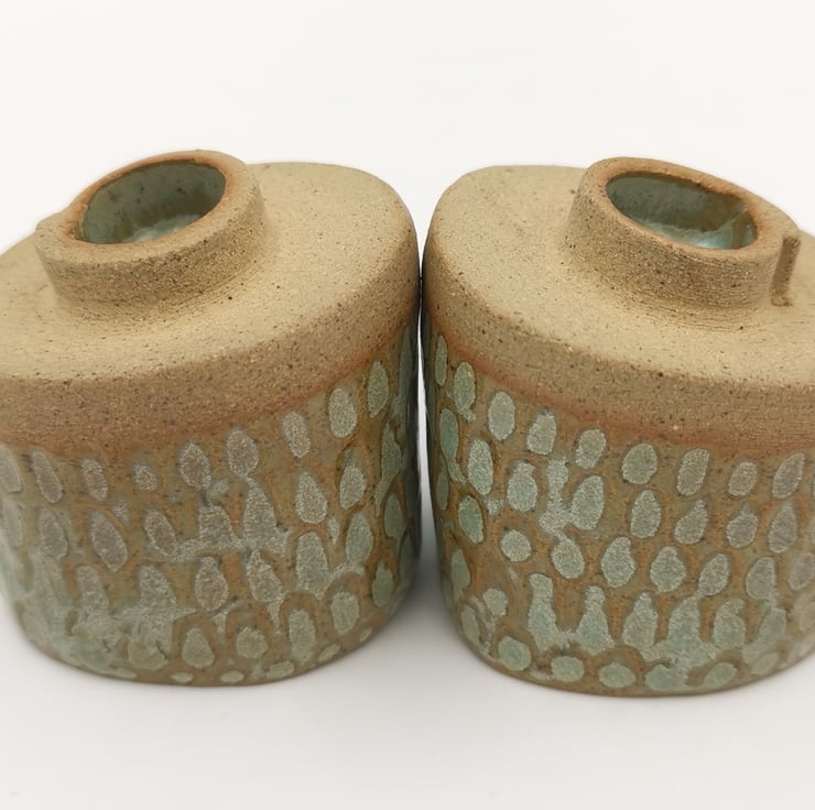 Handbuilt, hand-carved ceramic salt and pepper pots - cruet set. These salt and paper pots are slab built in stoneware clay with a carved 'fish scale' texture and finished in a turquoise glaze.