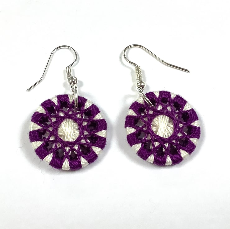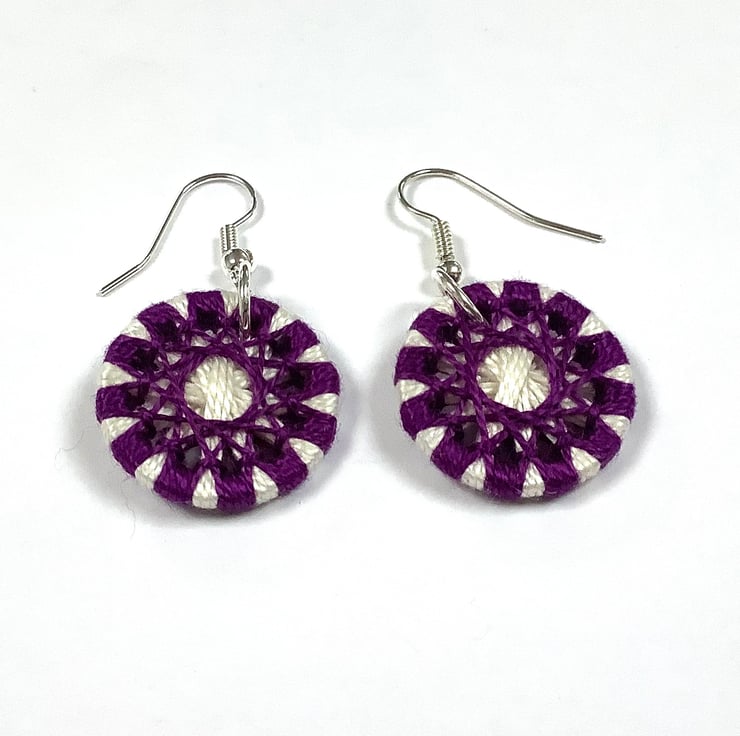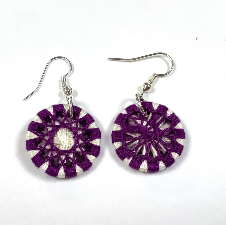 These earrings have been made by winding Cotton Perle thread around a metal ring to form intricate designs, They are known as Zwirnknopfe buttons. Each button measures 2cm and hangs from silver plated earwires.