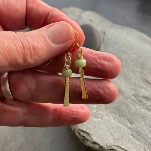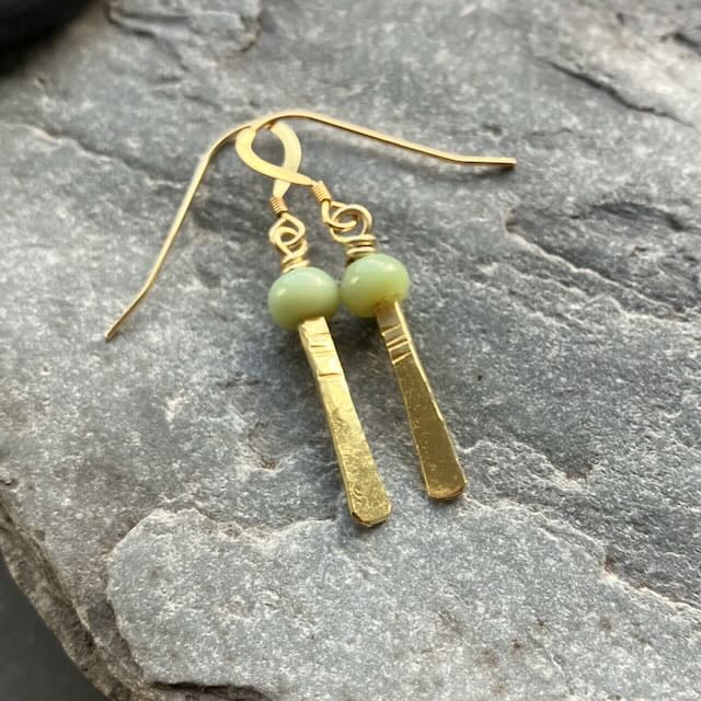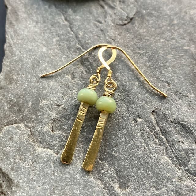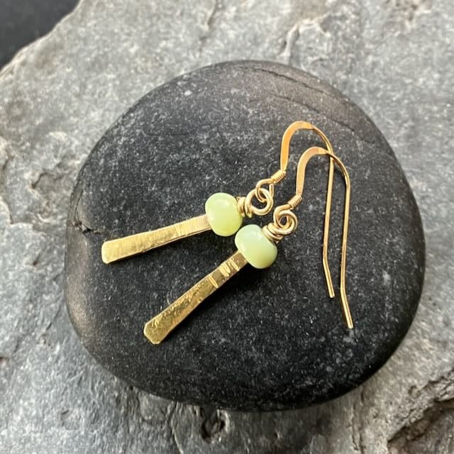 These sweet little drop earrings have a beaten brass tail topped with a pale green chrysoprase bead . I have put a simple incised pattern at the top of the drop. The ear wires are gold vermeil (gold covered sterling silver).