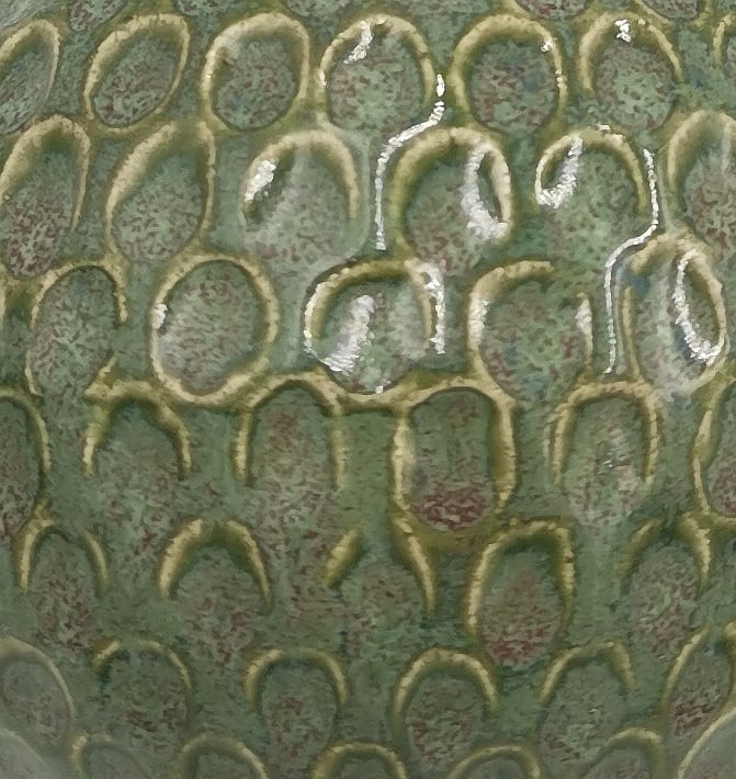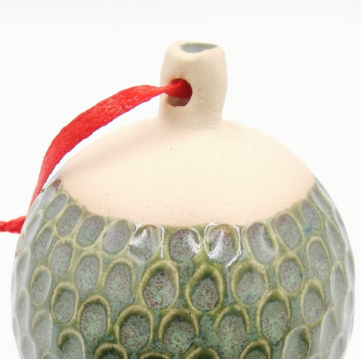 Ceramic Bauble. Hand-carved Bauble in stoneware clay, hand painted in a green glaze and finished with a ribbon hanger.