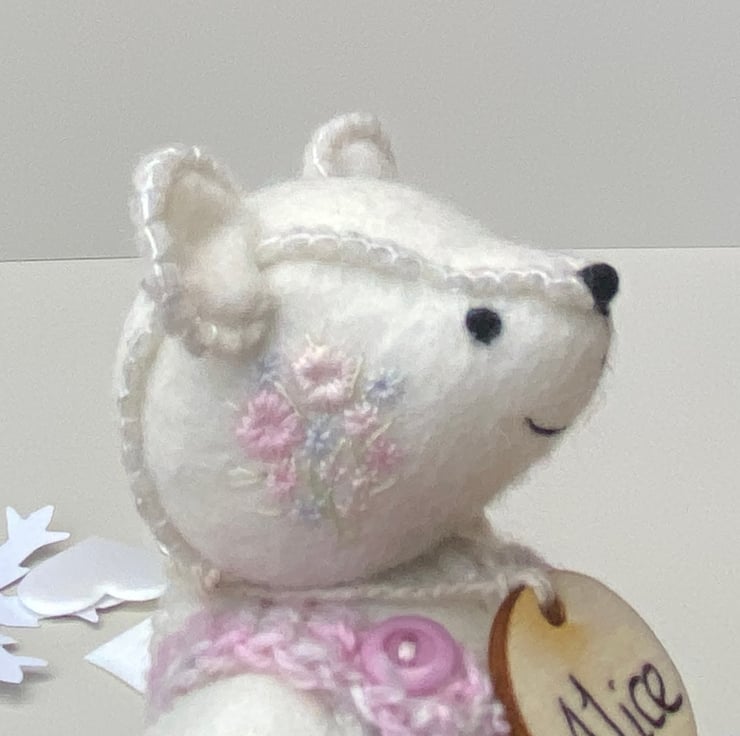 She wears her name on a wooden tag and Bearlescent is to the back of one ear on a polymer clay button.
