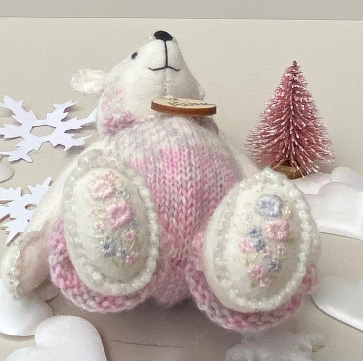 Hand embellished to her foot pads and one side of her face with delicate floral hand embroidery in pale pinks and blues.