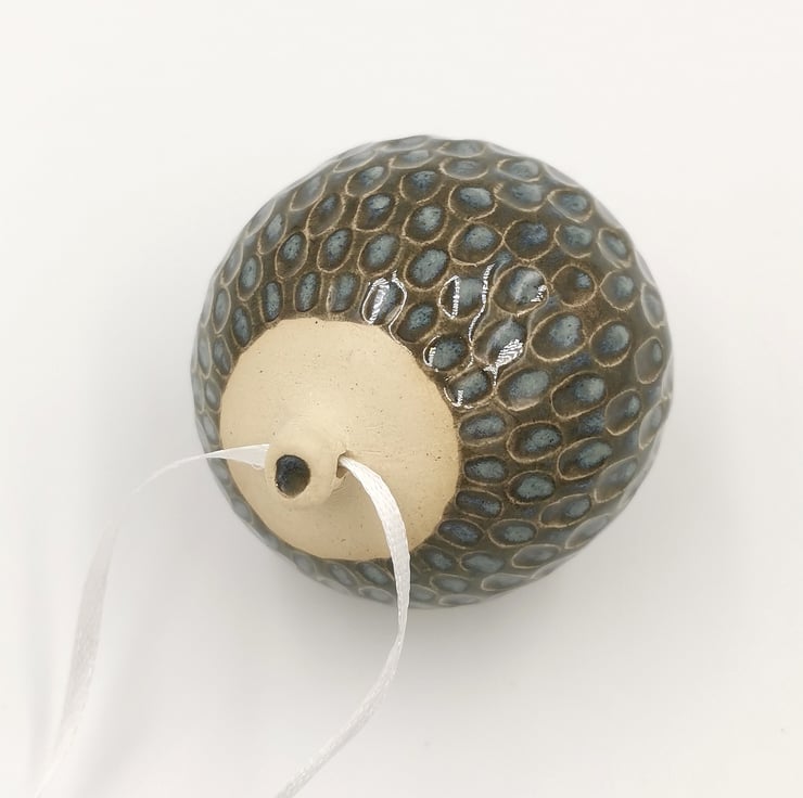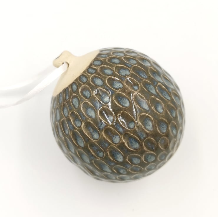 Ceramic Bauble. Hand-carved Bauble in stoneware clay, hand painted in a blue glaze and finished with a ribbon hanger.