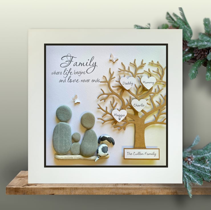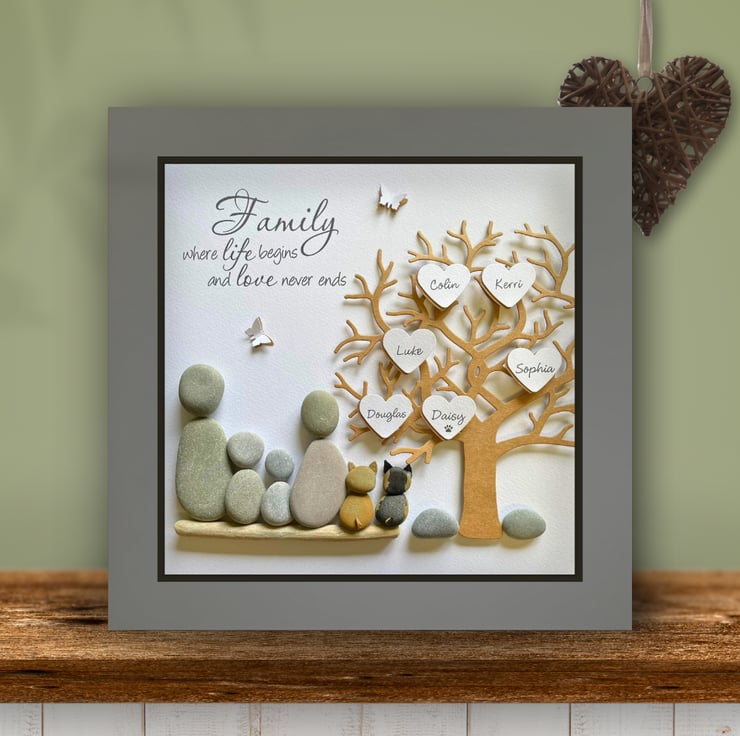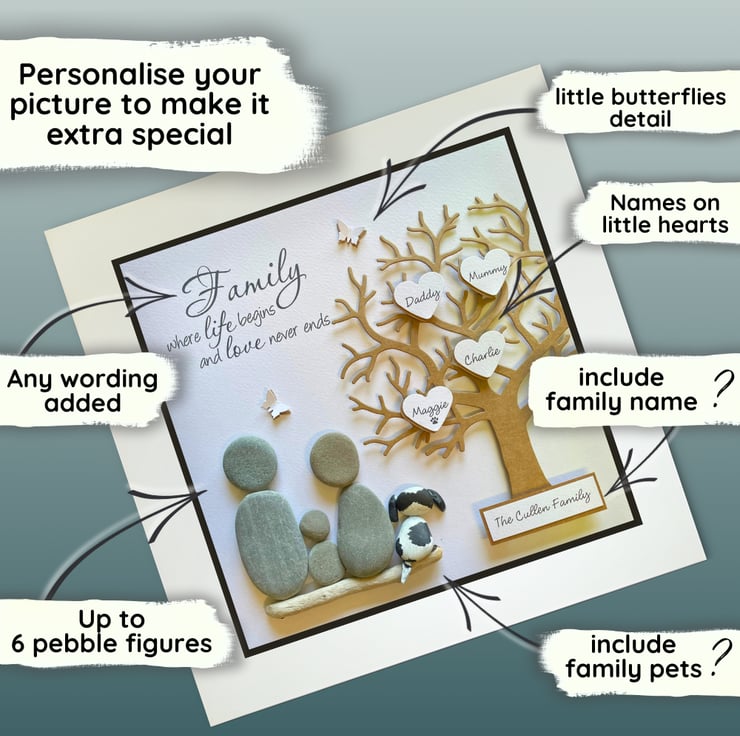 My Unique Pebble Art Family Tree pictures are handmade with Beach Pebbles - custom made to reflect your family as pebble people or pets, personalised with your names and any other wording of your choice.