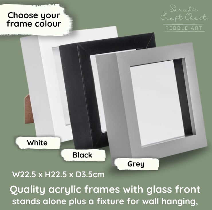 My pebble pictures are all designed and individually handmade by me in my home studio, Lancashire, England. I display my work in quality frames which I buy locally but are manufactured abroad.