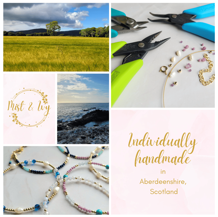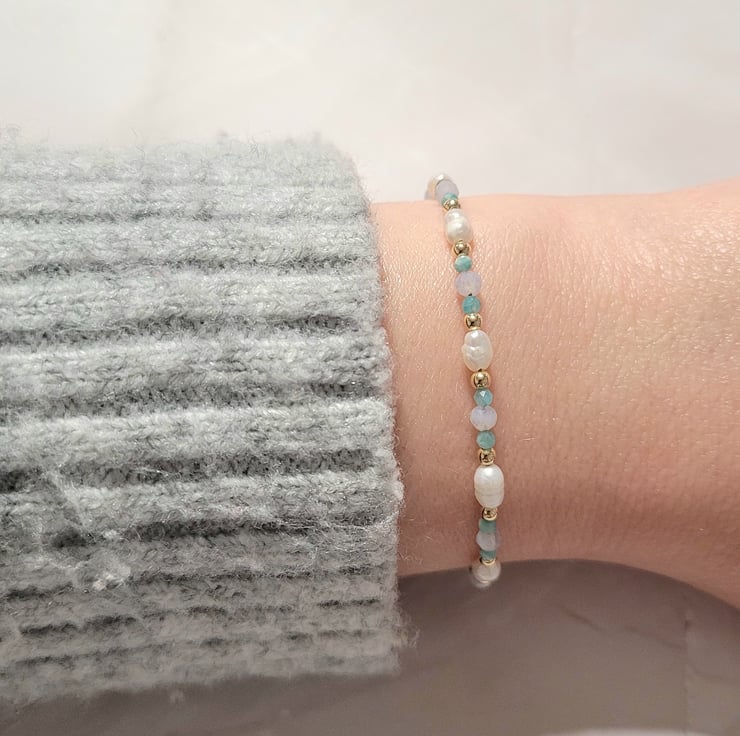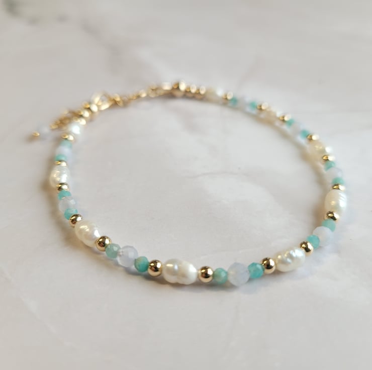 This delicate blue bracelet is handmade with freshwater pearls, semi precious amazonite and chalcedony gemstone beads. The pearls and gemstones are spaced with little 2.5mm gold filled beads. It is finished with a gold filled spring ring clasp and extension chain with a variable length of 17.5-20cm. I use high quality, strong, flexible beading wire and all components are gold filled.
