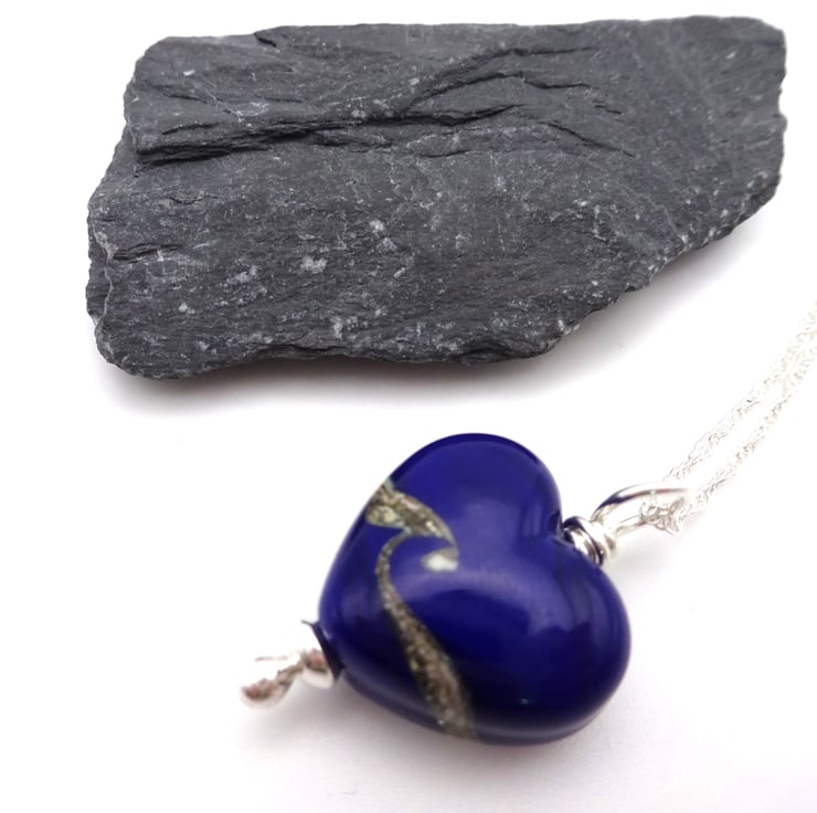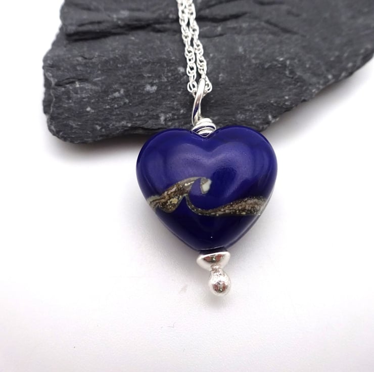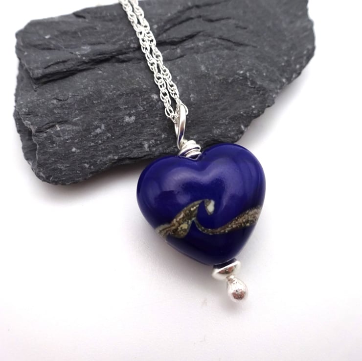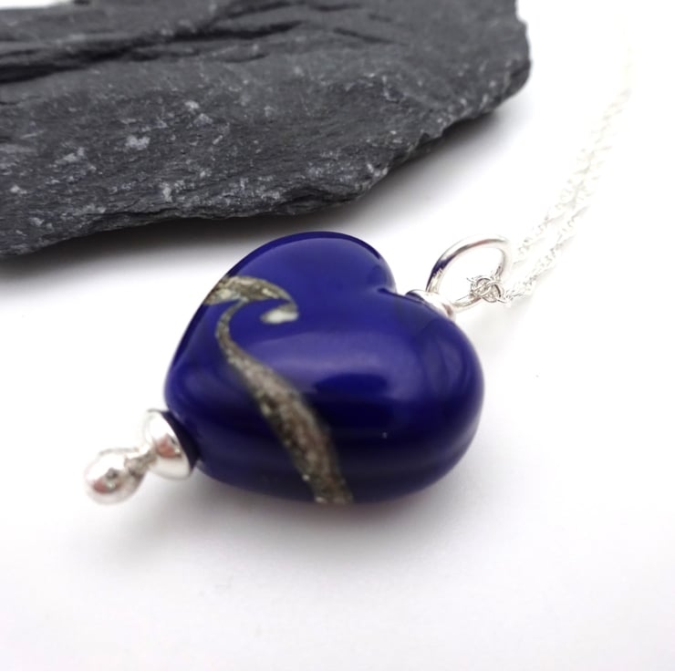 It features a sterling silver chain strung with a handmade lampwork glass cobalt blue heart pendant.