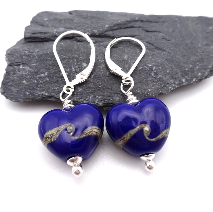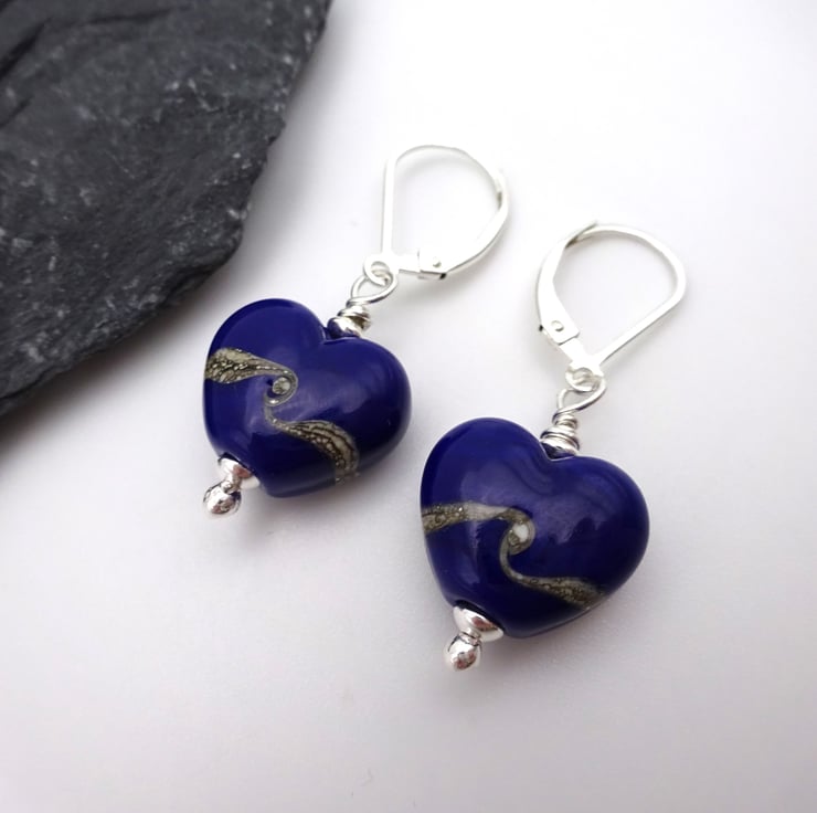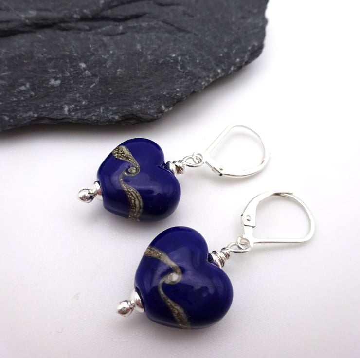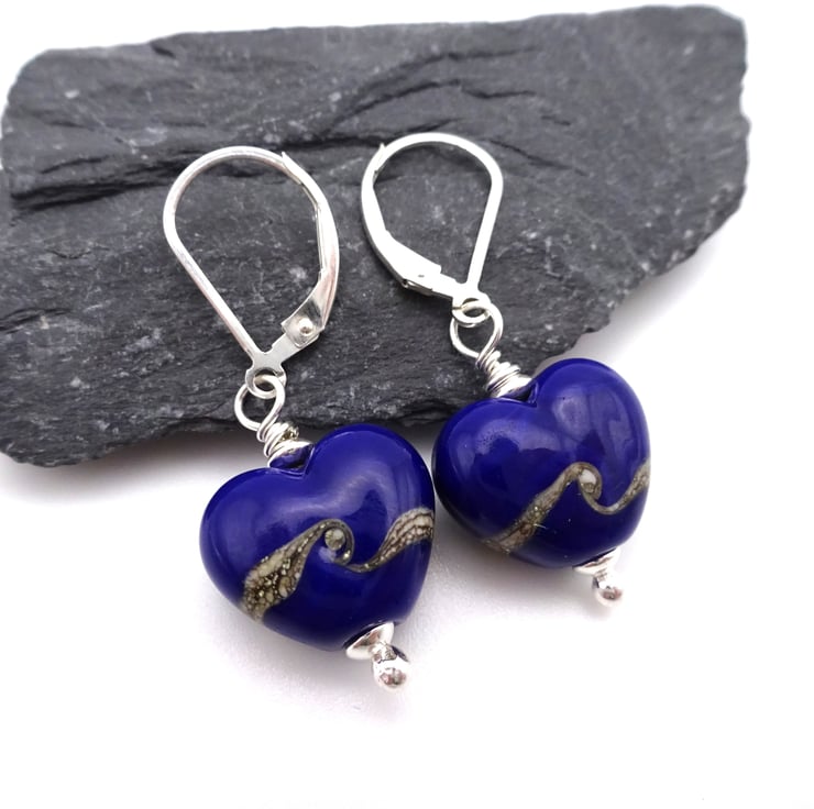 They feature sterling silver lever back ear wires, sterling silver beads and handmade lampwork glass heart beads.