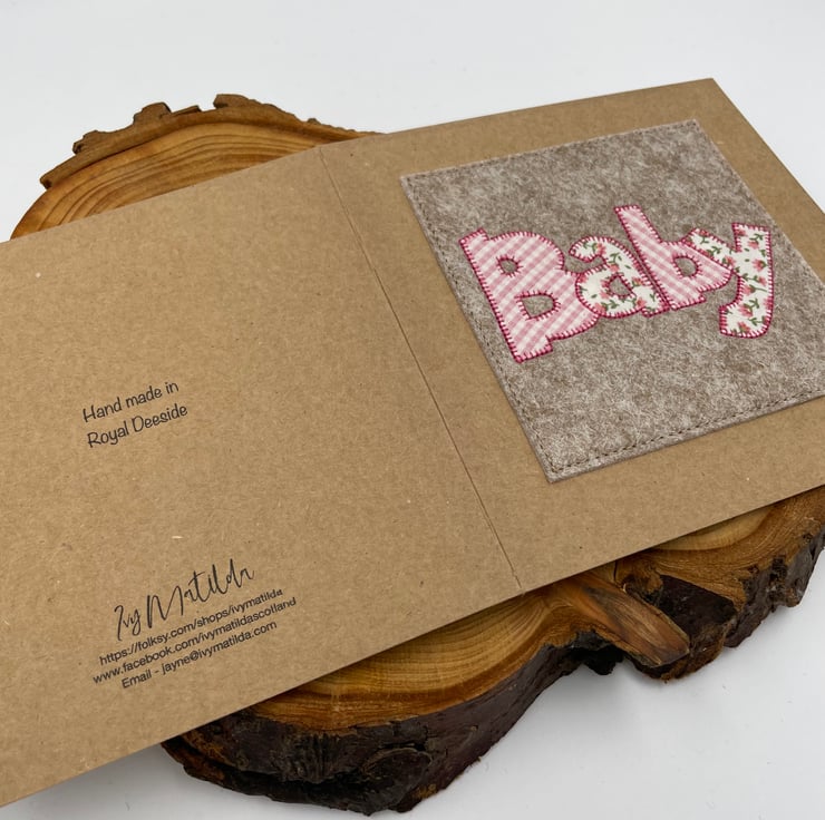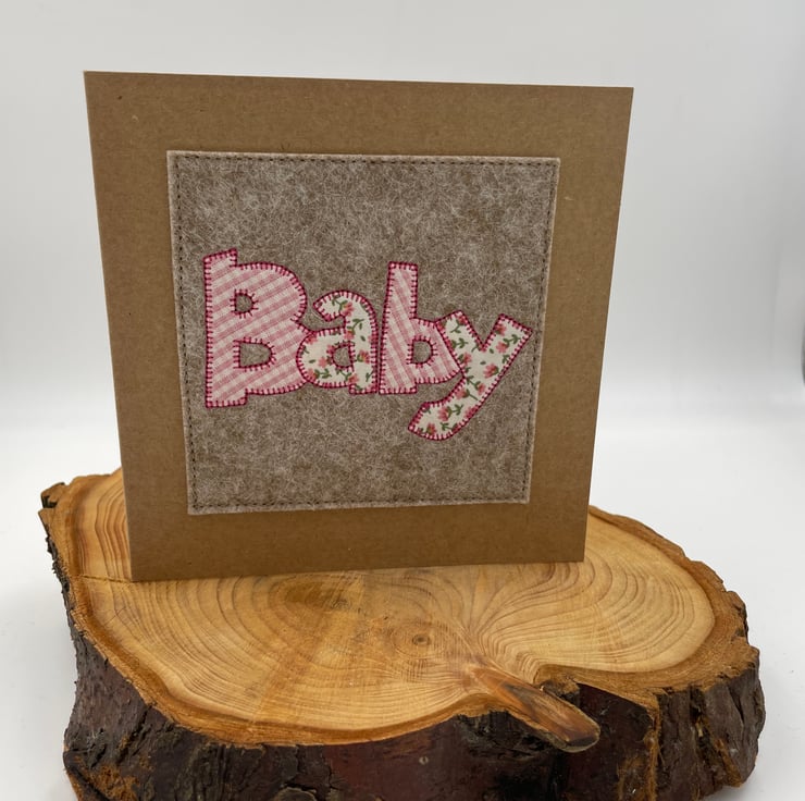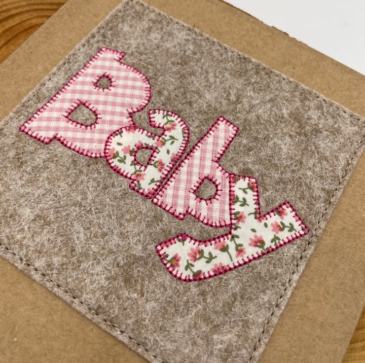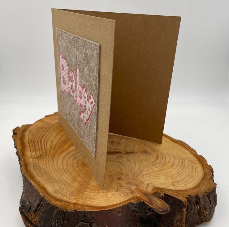Welcome a little bundle of joy with this handmade appliqué card, perfect for a new baby girl! The word "BABY" is stitched in sweet shades of pink onto soft, cozy beige wool felt, bringing a warm and homespun touch. Mounted on recycled card, it’s crafted with care, ready for you to add your own heartfelt message inside. A lovely keepsake for celebrating new beginnings and precious little smiles.