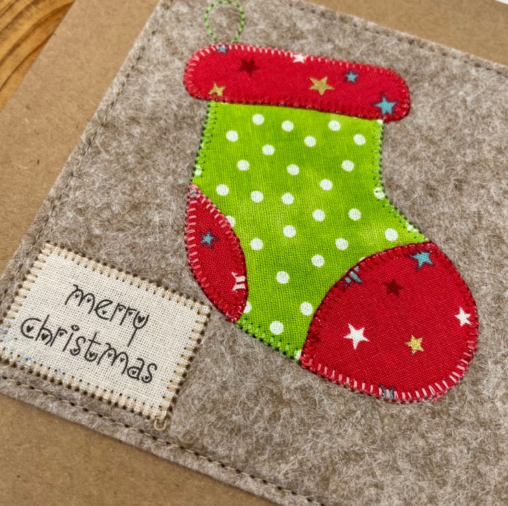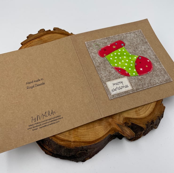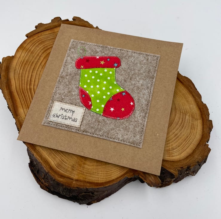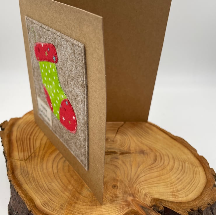 Send festive cheer with this handcrafted appliqué Christmas card! Featuring a cozy red and green Christmas stocking, carefully stitched onto warm beige wool felt, this card brings a touch of holiday tradition to any mantel. Mounted on eco-friendly recycled card with a charming "Merry Christmas" message, it’s the perfect way to share a warm seasonal greeting. Blank inside for your own merry wishes, this card is as thoughtful as it is festive—a keepsake to cherish all season long!