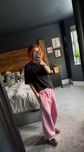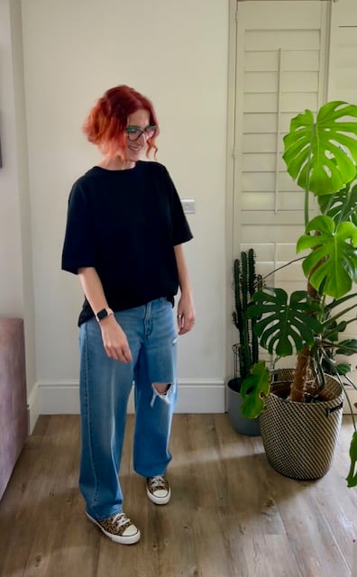 Model 1 is a size 10/s and 5ft 7', size up if you want extra baggy