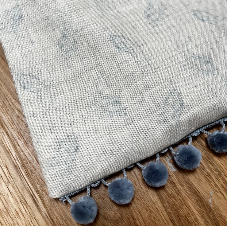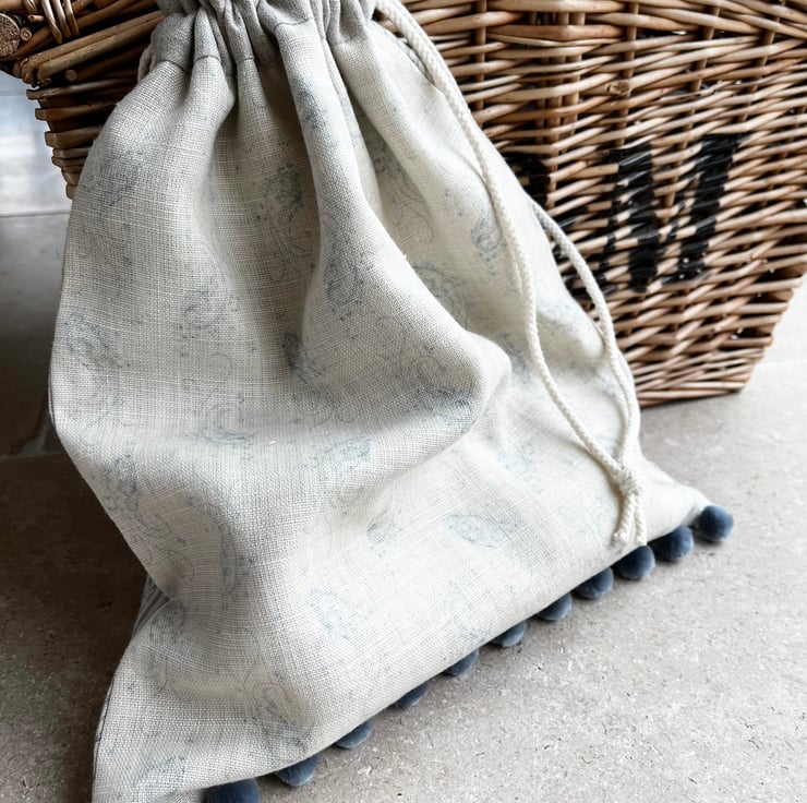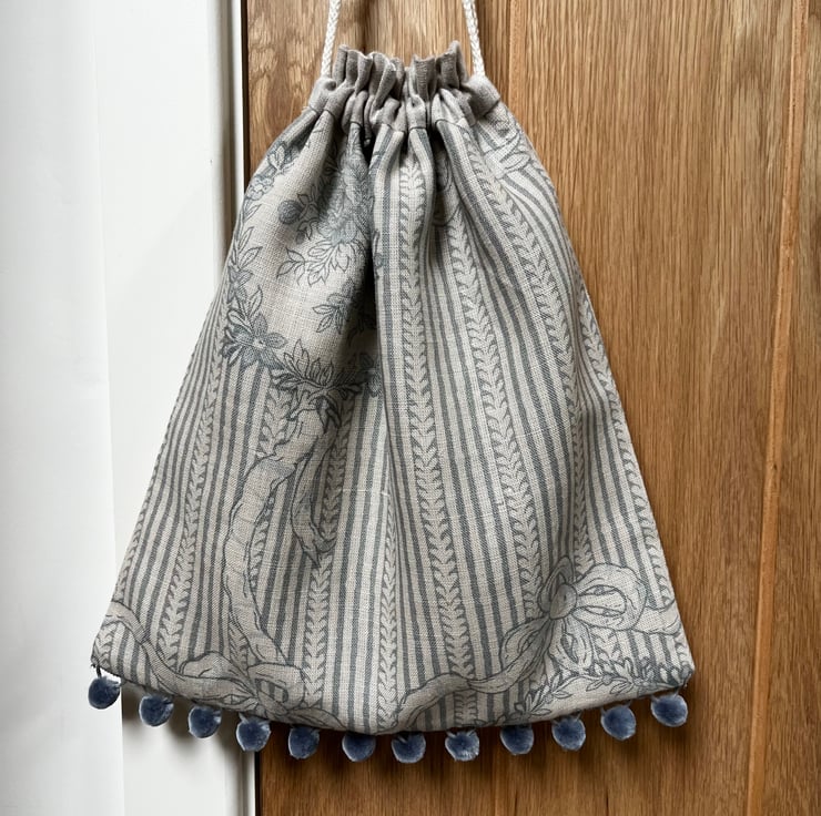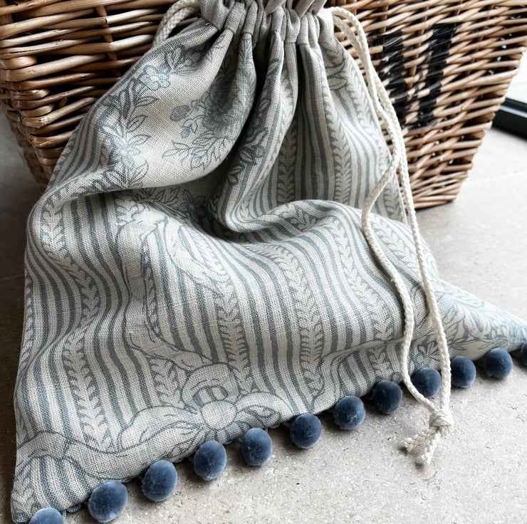 Pretty one of a kind drawstring bag in two coordinating Kate Foreman linen-mix fabrics with a pale blue print. Fully lined with striped linen and finished with blue-grey velvety pompoms.