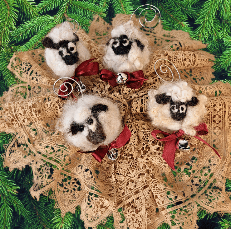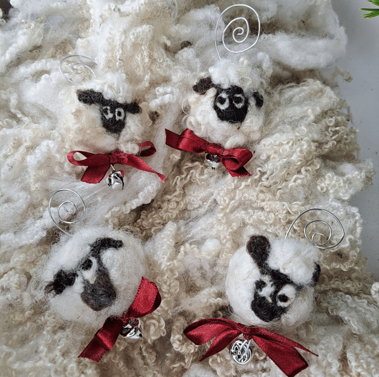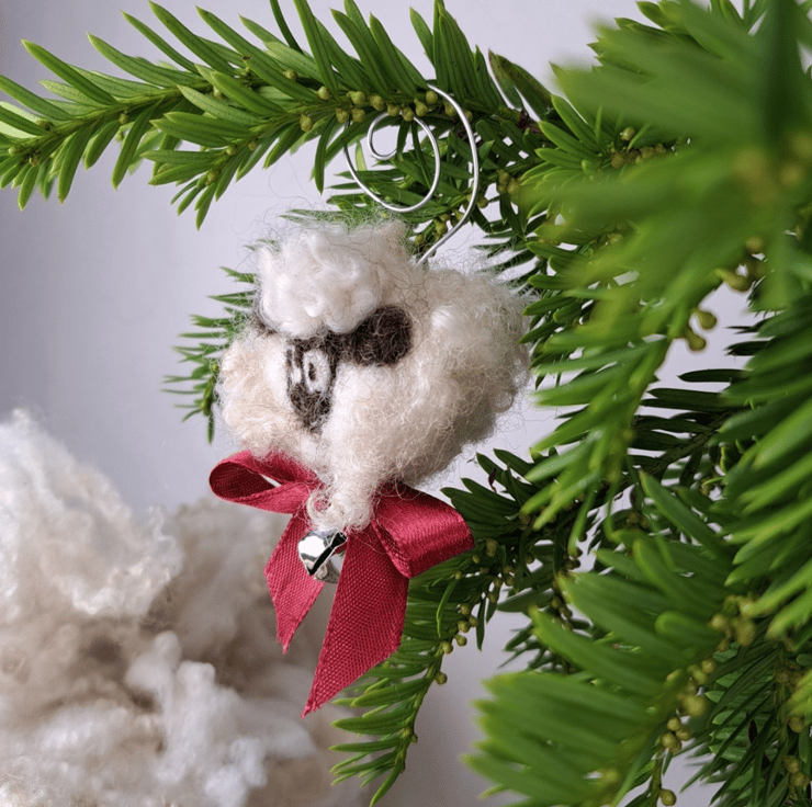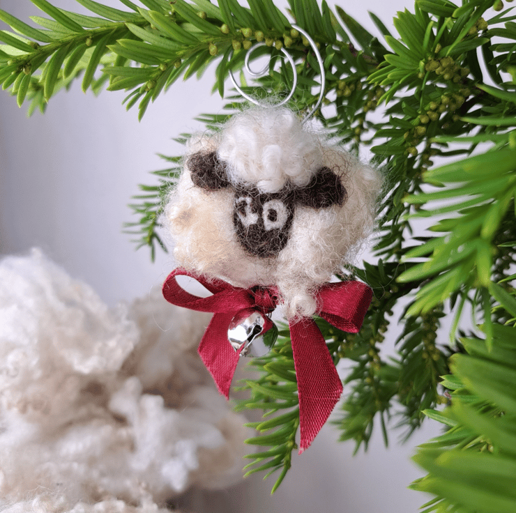 Sheep Christmas Bauble. Natural Handmade tree decoration made with pure British Wool bought directly from local farmers in Staffordshire. No two are alike. Wet felted with needle felted finishing touches. Each has its small grazing bell attached to a copper or silver coloured wire spiral and decorated with a satin or organza ribbon bow. These little sheep ornaments are ready to be hung on the tree real or artificial.
