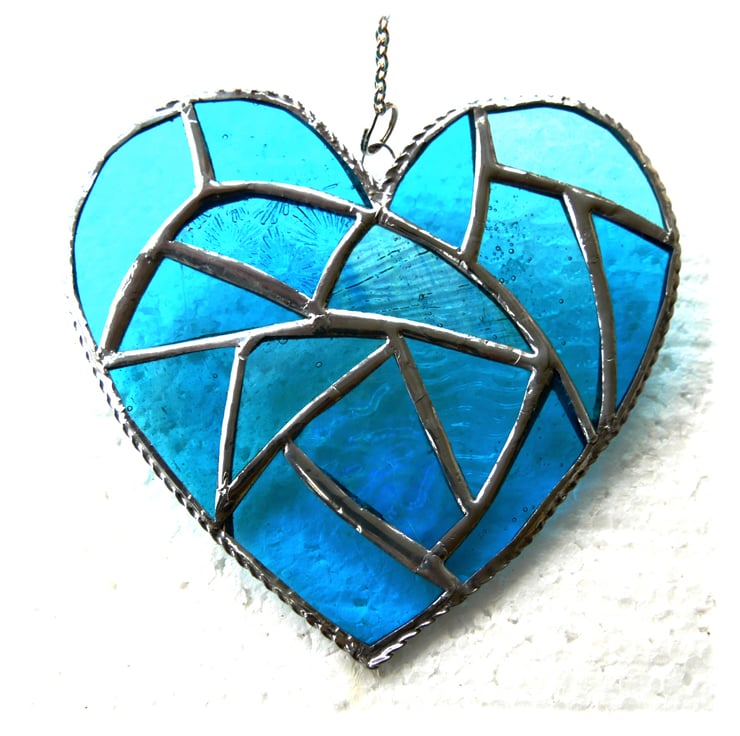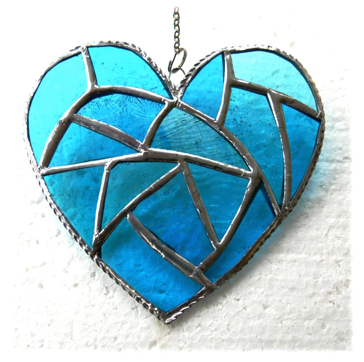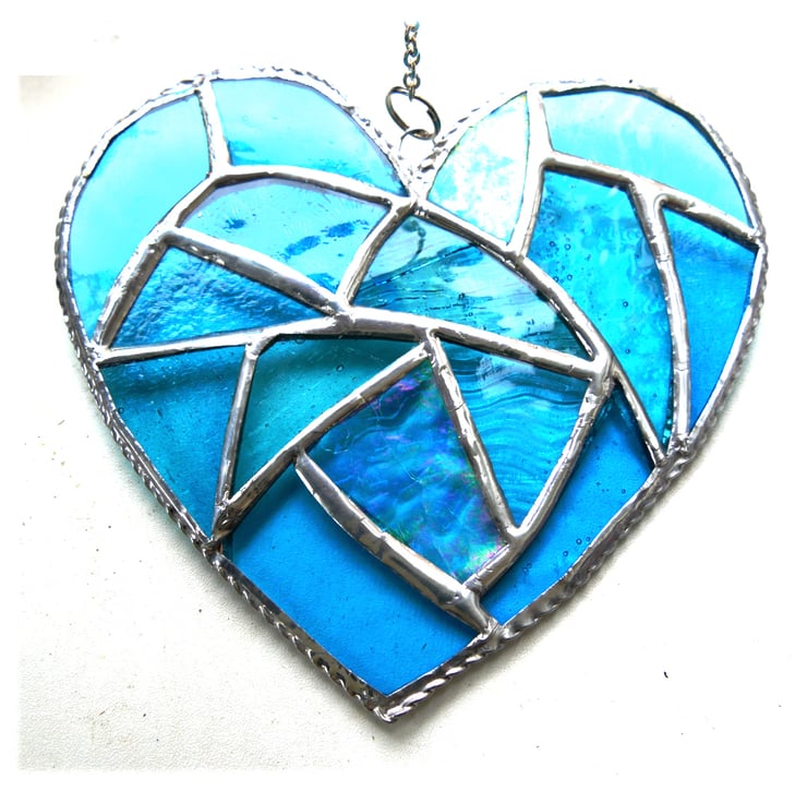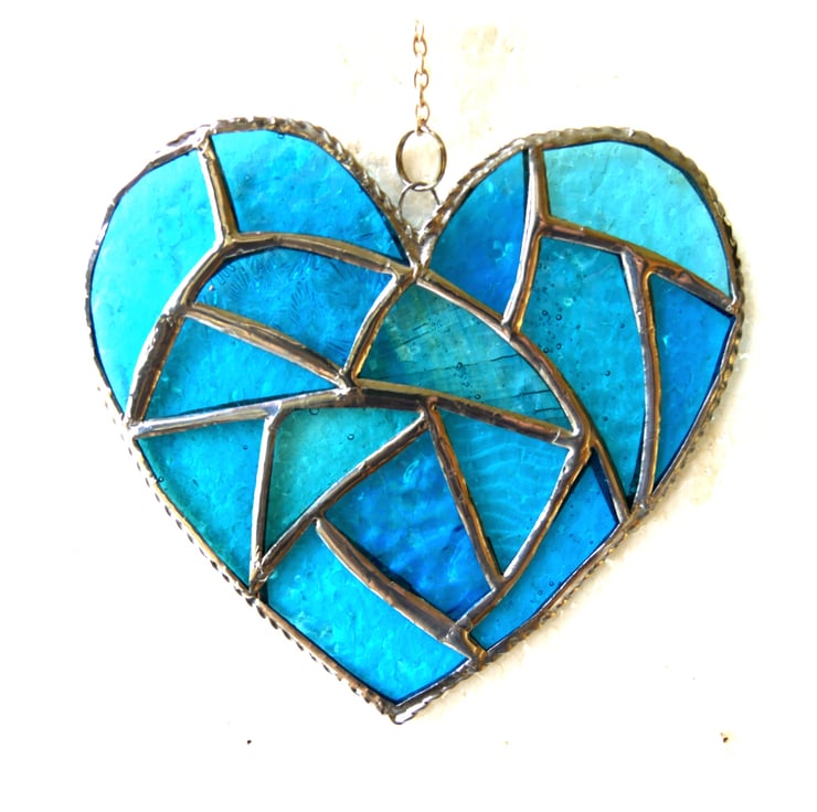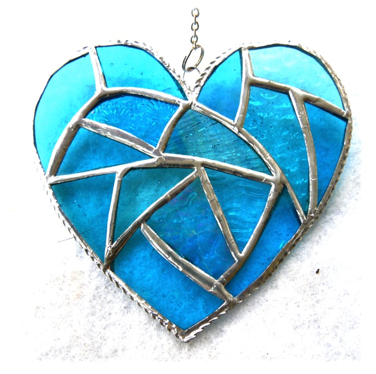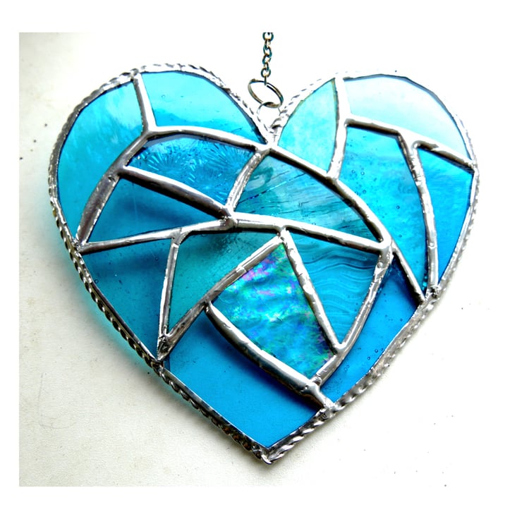 Fat Patchwork Heart Suncatcher Turquoise Stained Glass Handmade 032