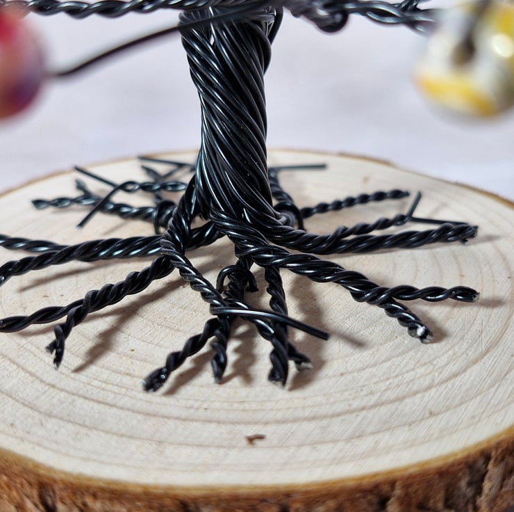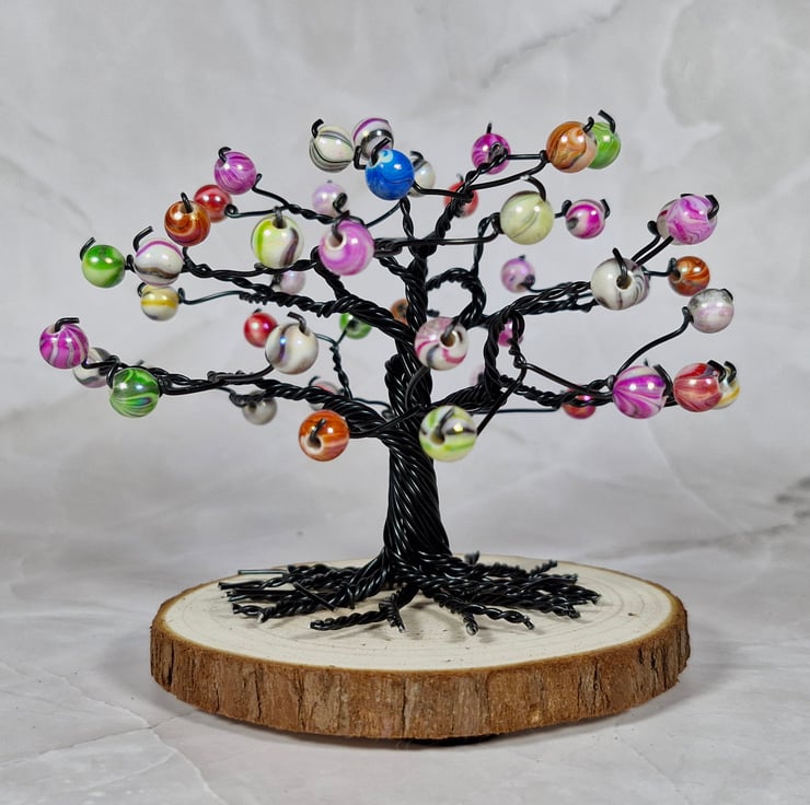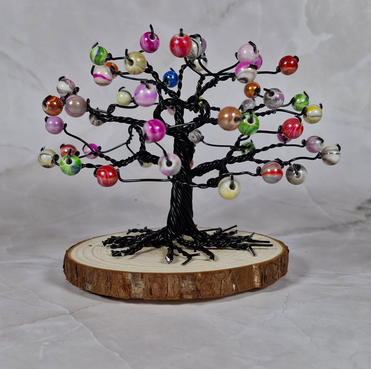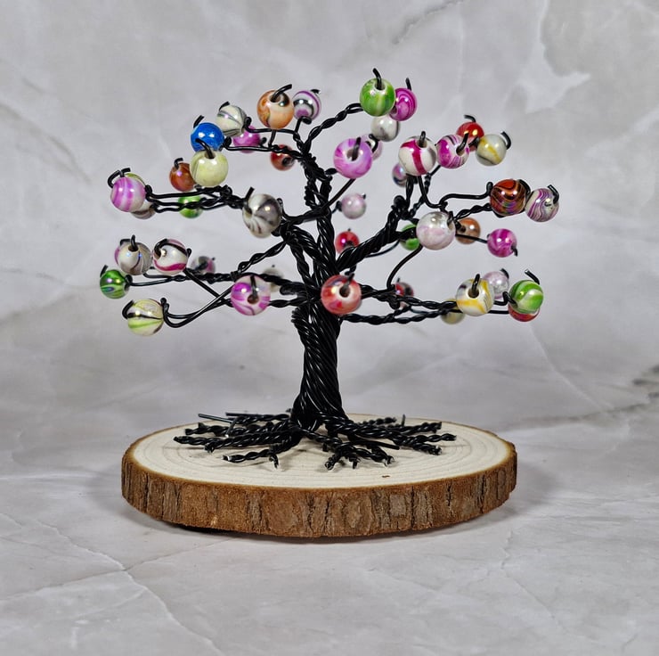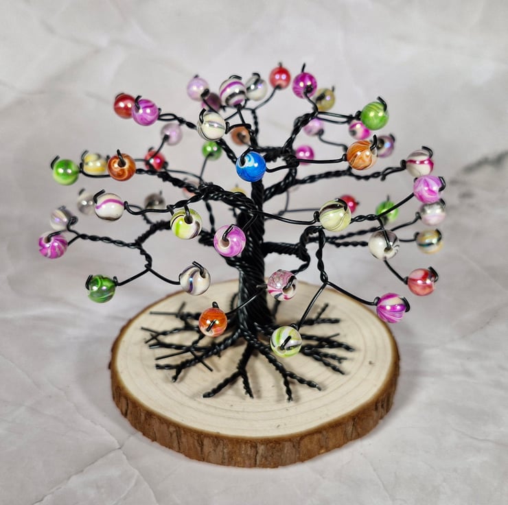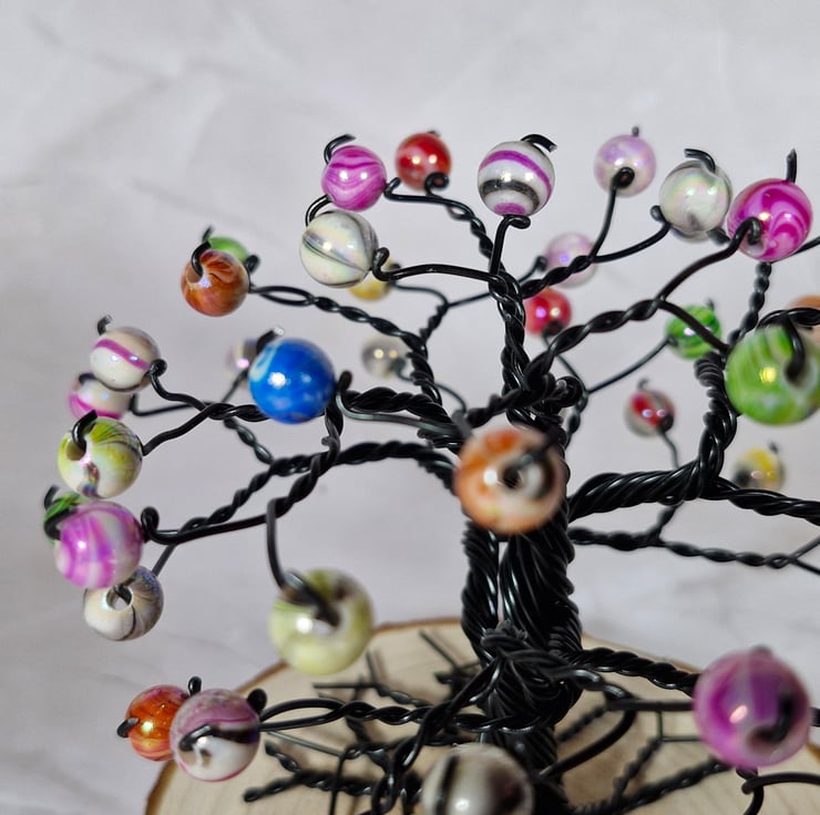 This small wire tree has been carefully created using black 18 gauge (1mm) aluminium wire, threaded with 50 colourful 8mm acrylic beads.