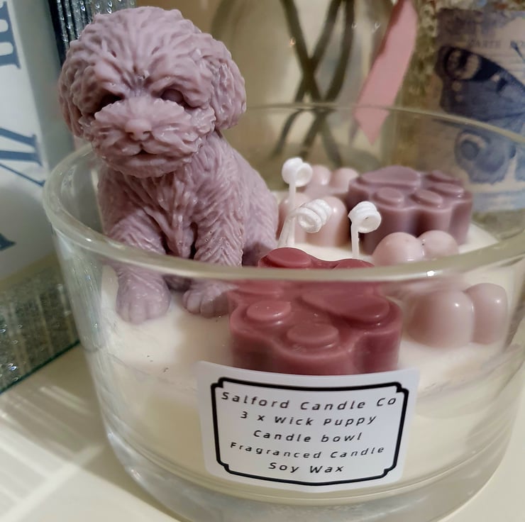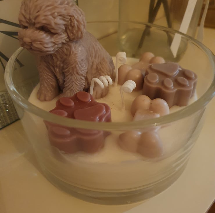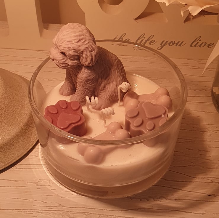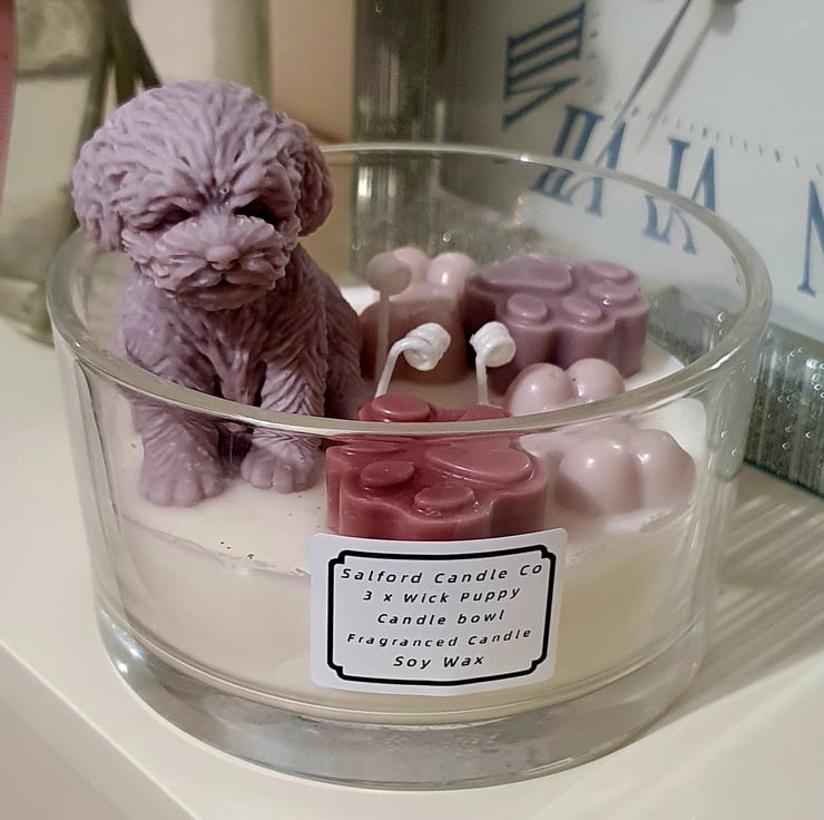A large 3 x wick Candle. With a cute puppy Candle. Little wax paws and bones. All made with Soy Wax. Fragranced. Handmade Hand poured and hand decorated. One of a kind Artisan Candle. Perfect for your own home or as a beautiful unique gift.
