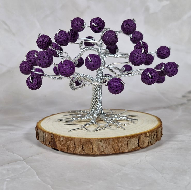 This small wire tree has been carefully created using silver 18 gauge (1mm) aluminium wire, threaded with approximately 35 purple Synthetic Lava 10mm beads.