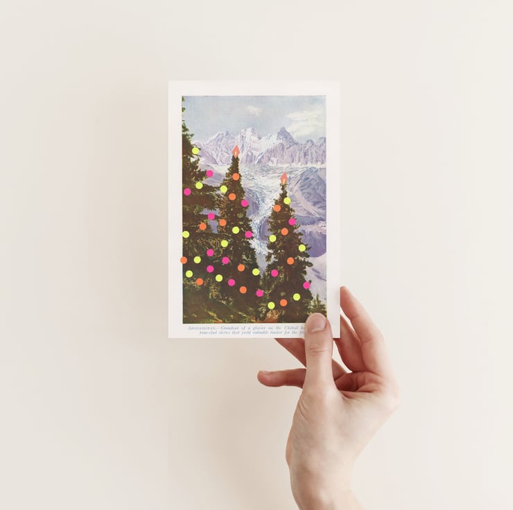A vintage Christmas card with a beautiful outdoor scene. A group of pine trees stand tall, decorated for the big day. A range of snowy mountains are behind, as far as the eye can see.