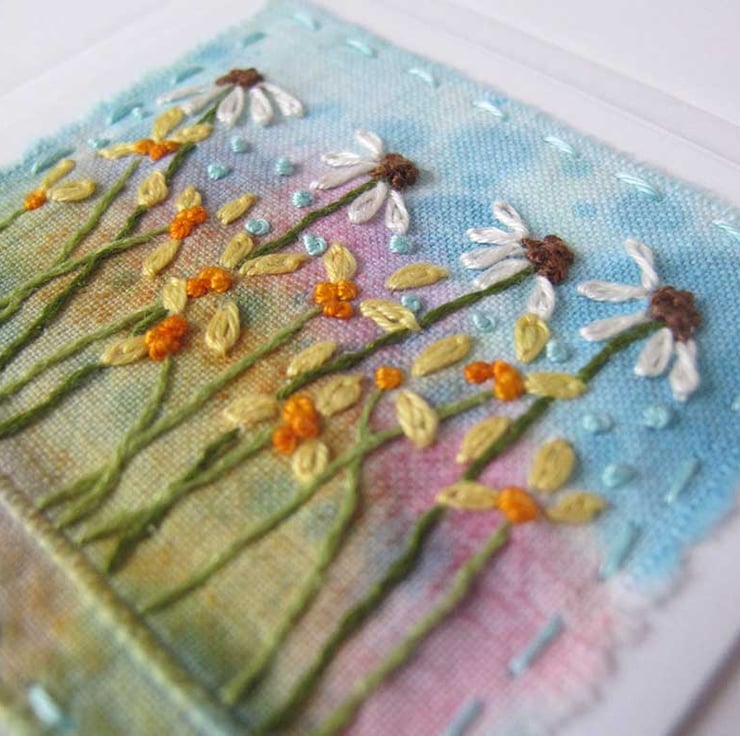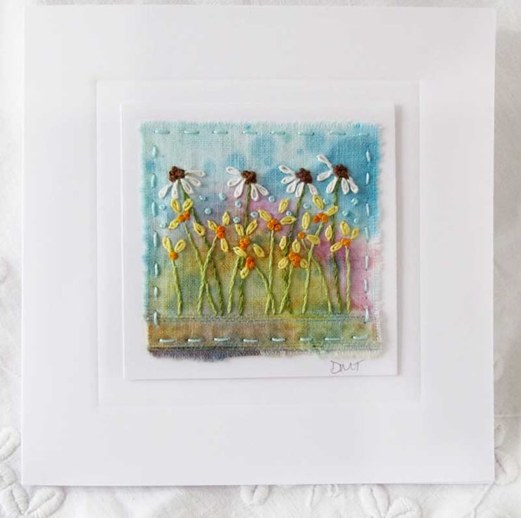 This beautiful card has been embroidered by hand onto fabric that I have dyed in shades of green, pink and turquoise. The design is of mixed flowers in shades of white, yellow, and orange - perfect for a special occasion, or perhaps framing it as it is. It has been mounted on a card base and is surrounded by an embossed square. The card has been left blank for your own message.