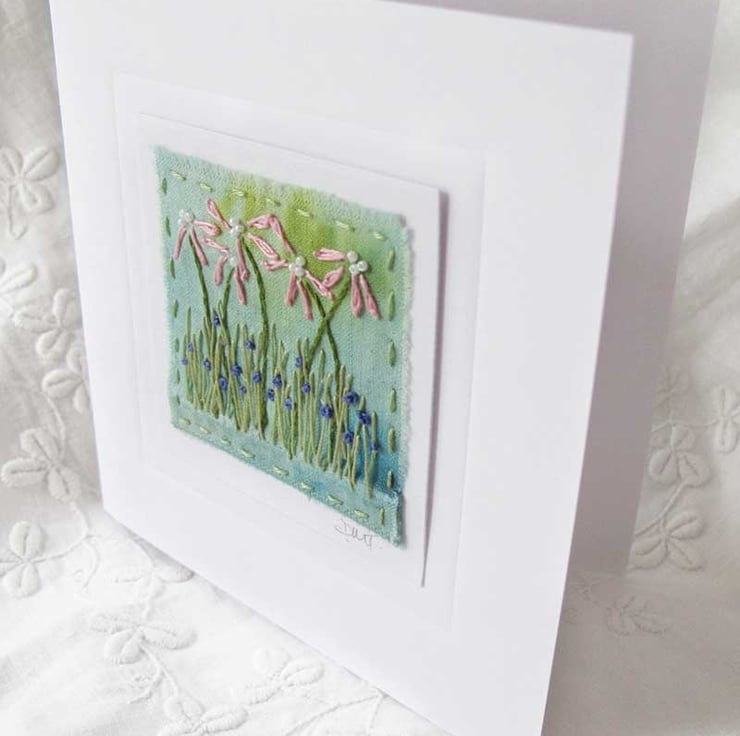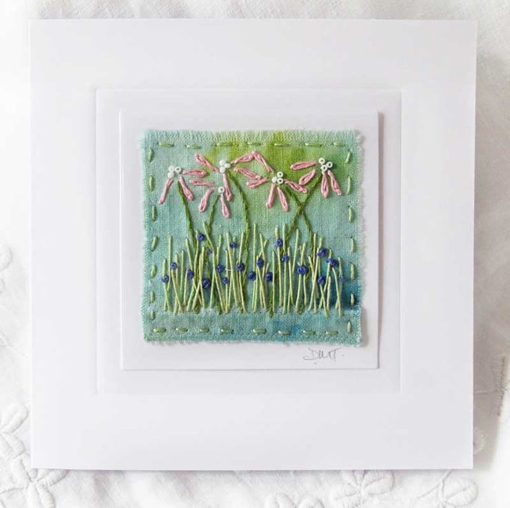 This beautiful card has been embroidered by hand onto fabric that I have dyed in shades of green and turquoise. The design is of stylised flowers in pink and blue - perfect for a special occasion, or perhaps framing it as it is. It has been mounted on a card base and is surrounded by an embossed square. The card has been left blank for your own message.