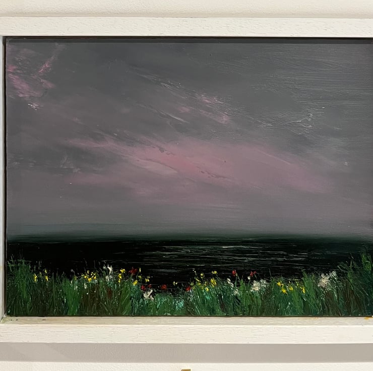 An original oil painting framed in a solid white wood tray frame.