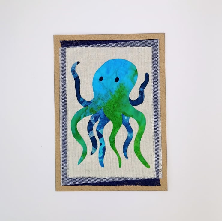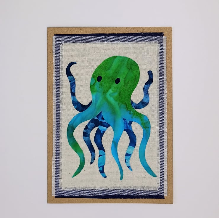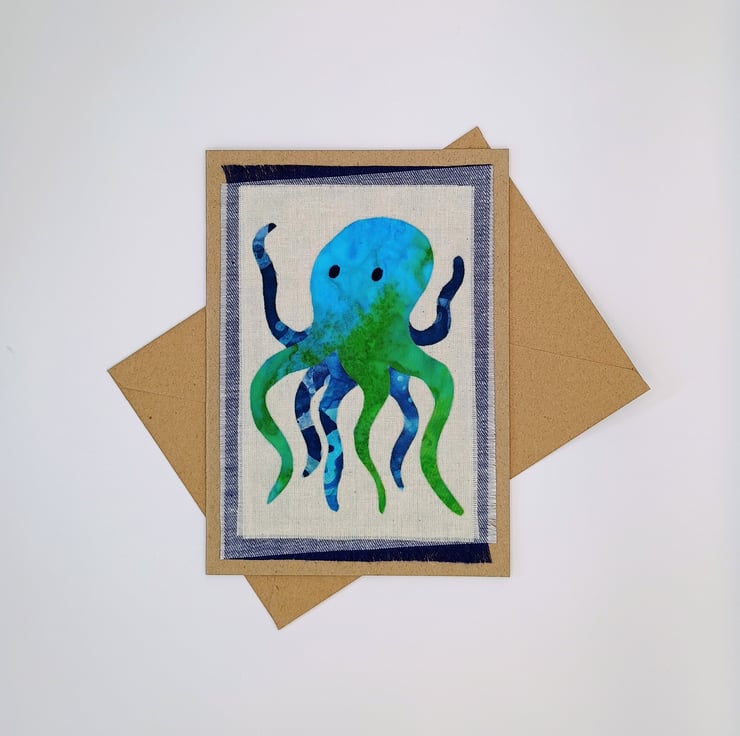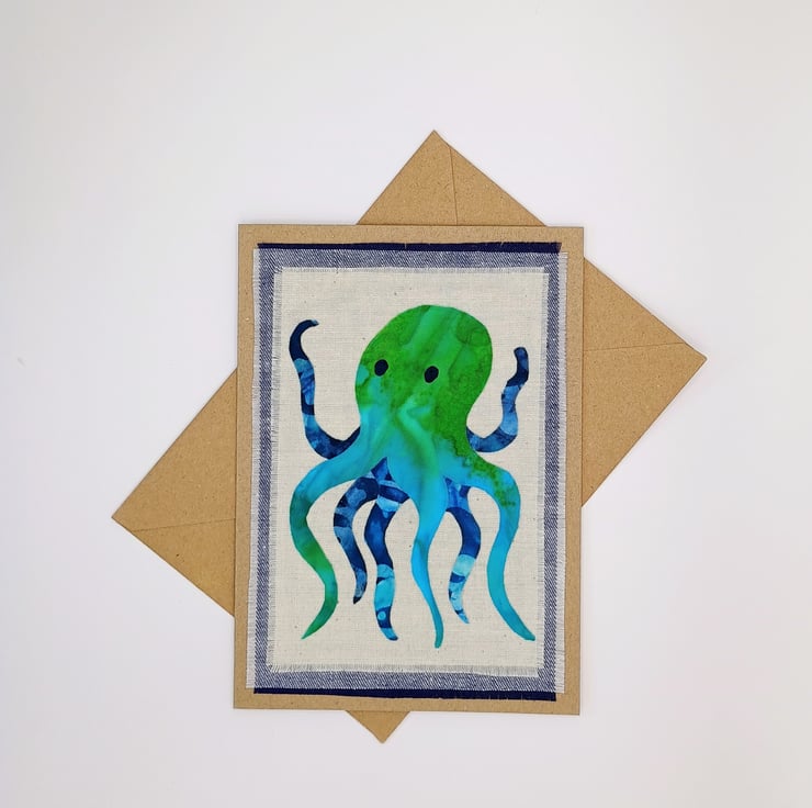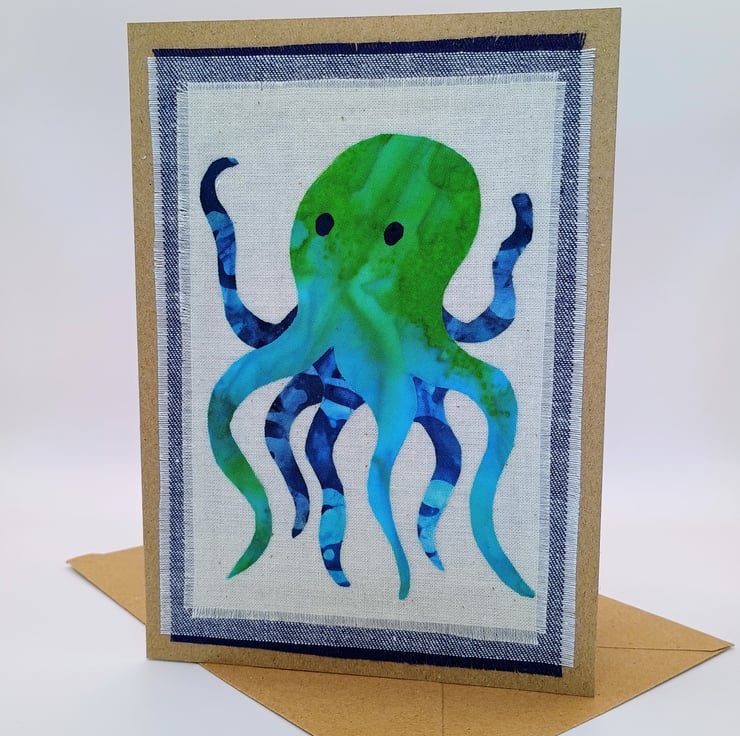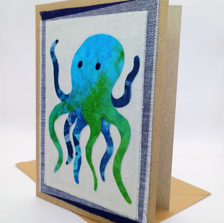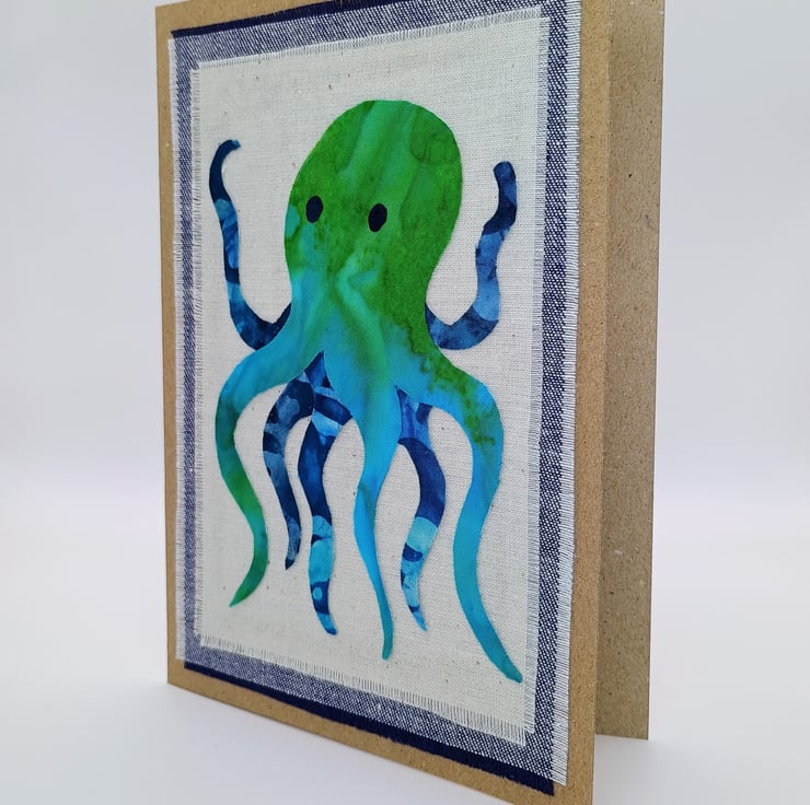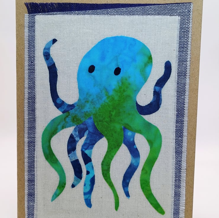A handmade fabric 'Octopus' greetings card. Perfect as an adult’s or child’s Birthday card, Notelet or Thank You card. Made using bright batik cotton fabrics, mounted on natural calico with a complimentary sea blue fabric border. Left as a blank card so you can add your own personal message, whatever the occasion.