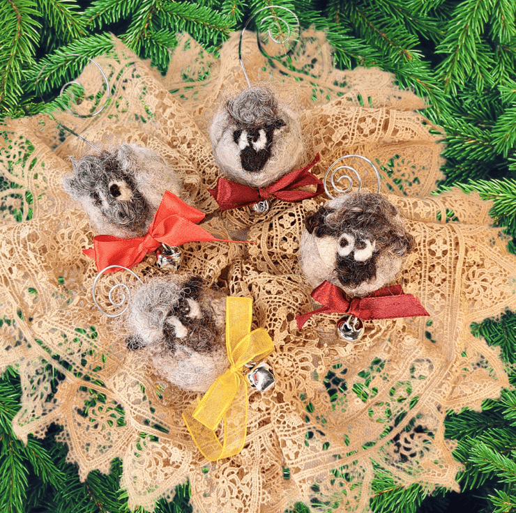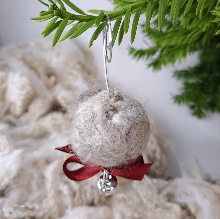 One Sheep Christmas Bauble. Natural Handmade tree decoration made with pure British Wool bought directly from local farmers in Staffordshire. No two are alike. Wet felted with needle felted finishing touches. Each has its small grazing bell attached to a copper or silver coloured wire spiral and decorated with a satin or organza ribbon bow. These little sheep ornaments are ready to be hung on the tree real or artificial.