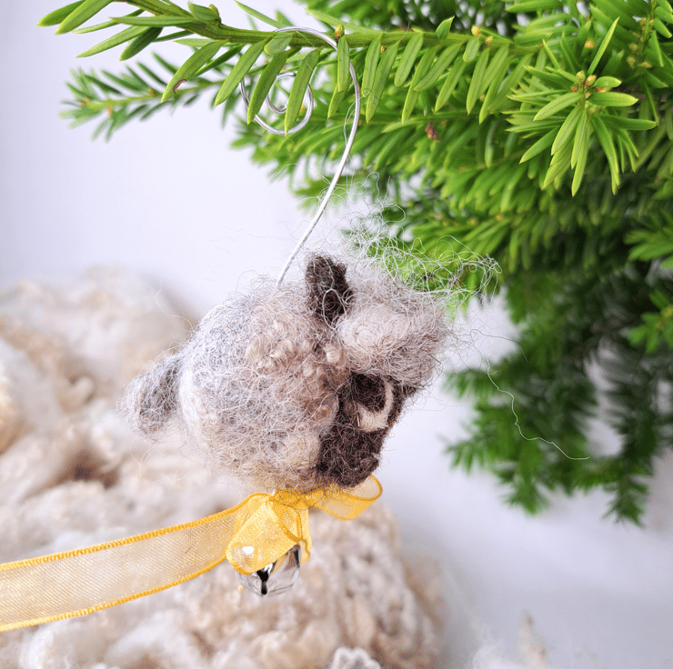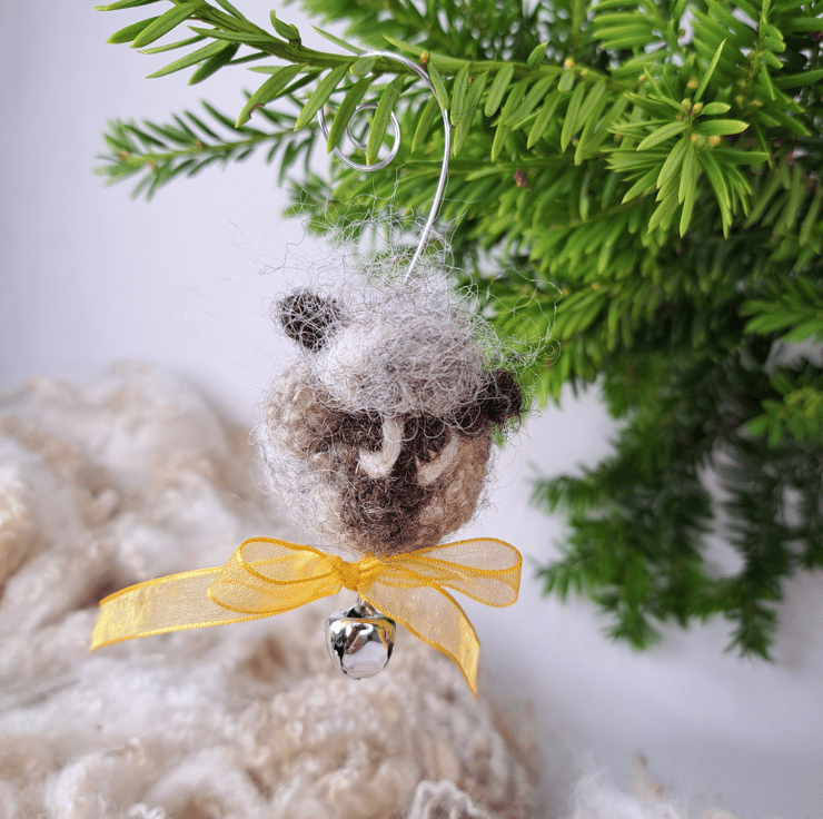 One Sheep Christmas Bauble. Natural Handmade tree decoration made with pure British Wool bought directly from local farmers in Staffordshire. No two are alike. Wet felted with needle felted finishing touches. Each has its small grazing bell attached to a copper or silver coloured wire spiral and decorated with a satin or organza ribbon bow. These little sheep ornaments are ready to be hung on the tree real or artificial.